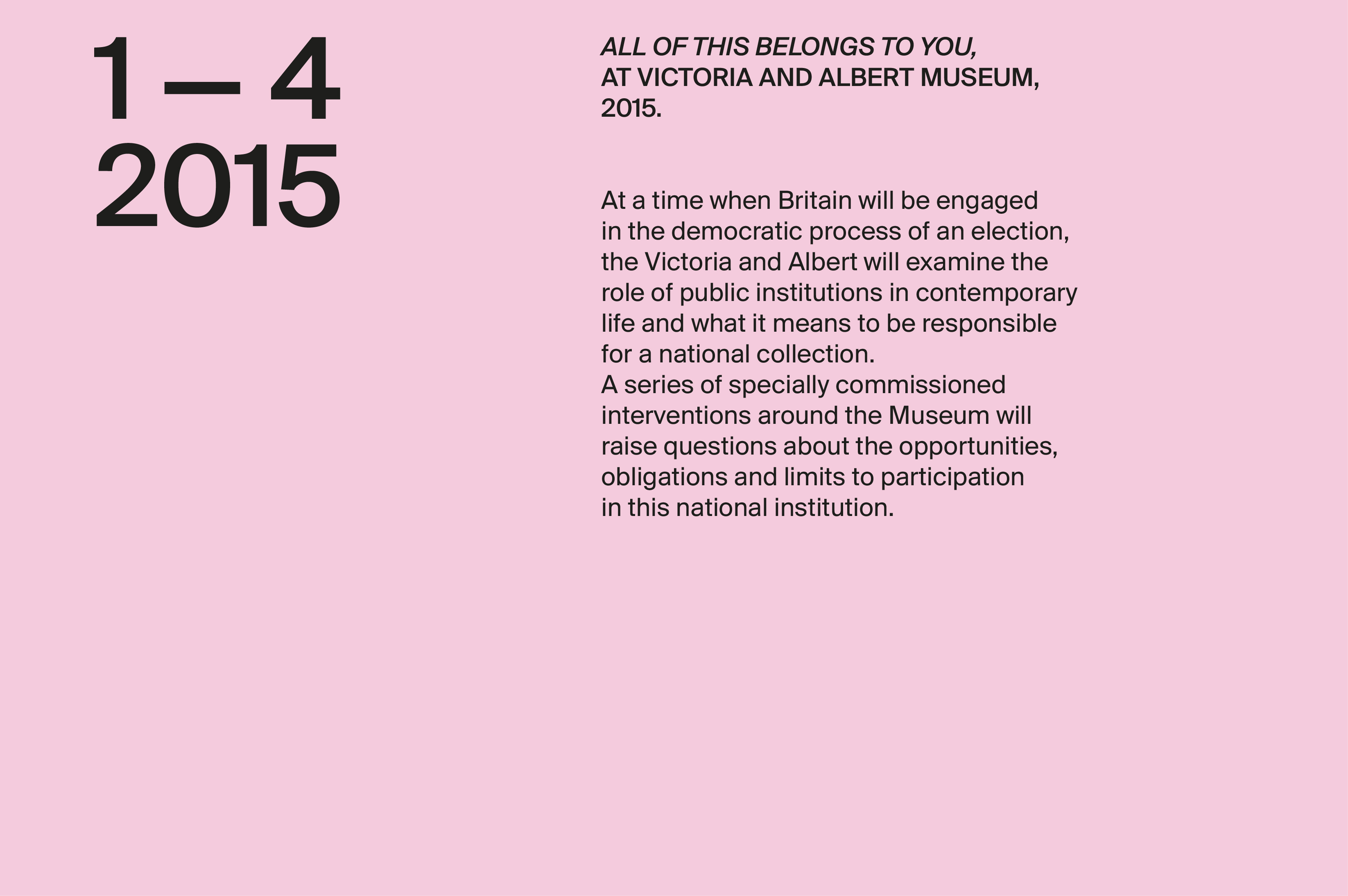 At a time when Britain will be engaged in the democratic process of an election, the Victoria and Albert will examine the role of public institutions in contemporary life and what it means to be responsible for a national collection. A series of specially commissioned interventions around the Museum will raise questions about the opportunities, obligations and limits to participation in this national institution.