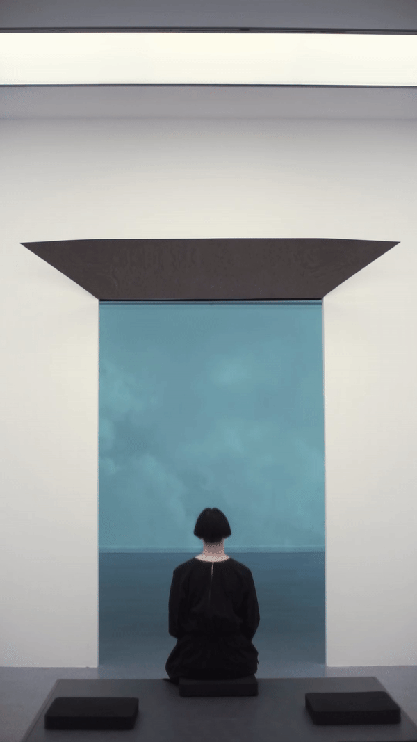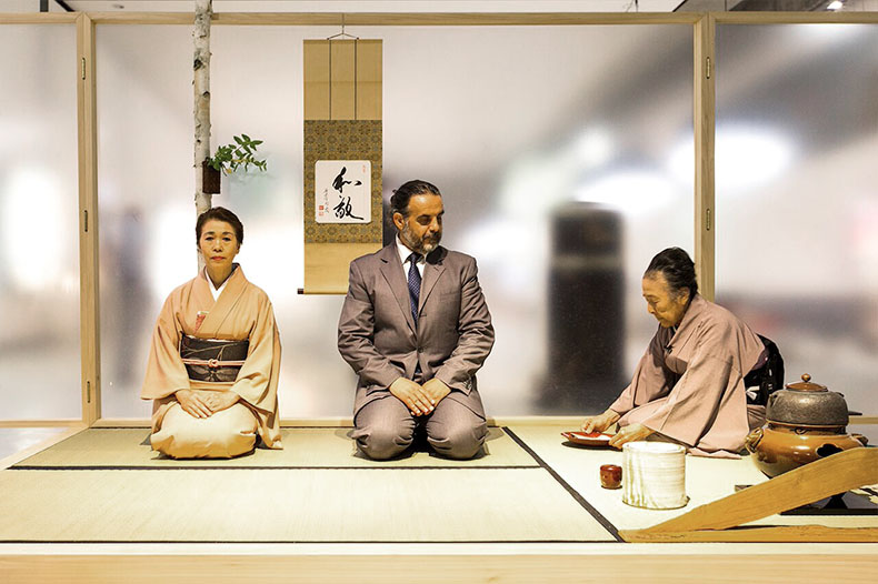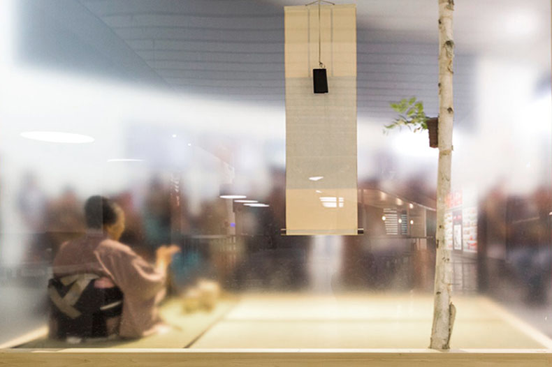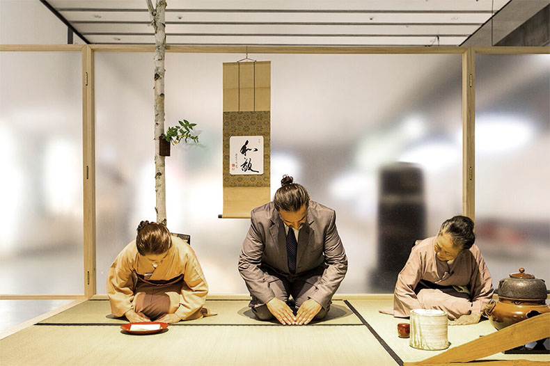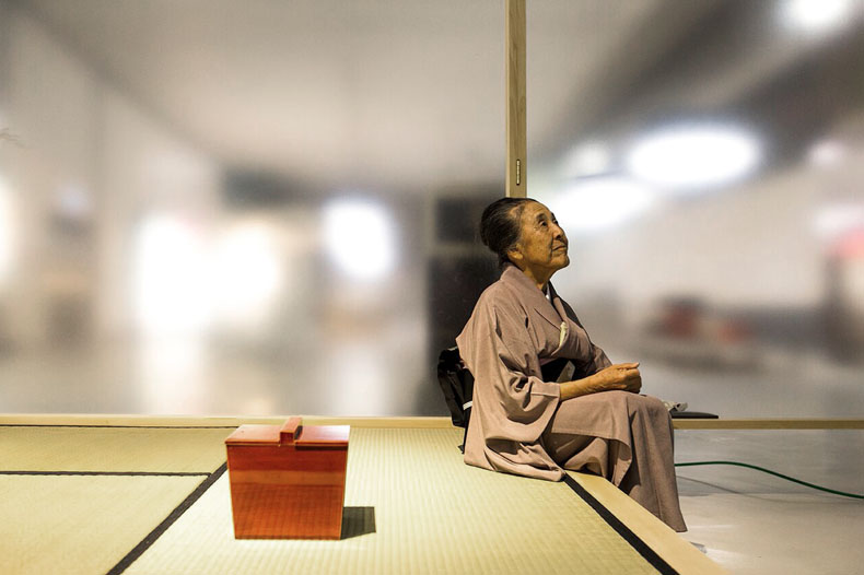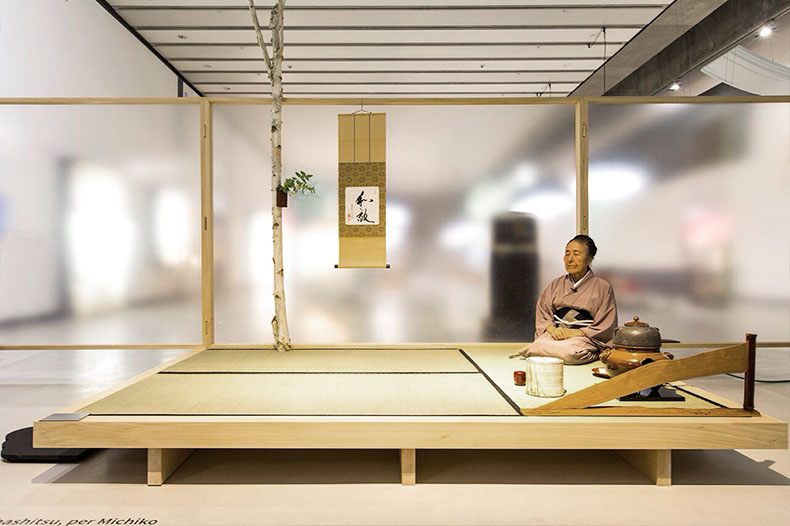 The tea room is designed to frame, without disturbing, the geometric gestures of Michiko, who slowly moves through space, leaving nothing to chance. The four walls of the room can be fully opened during the performance, in order to make room for a larger audience. The intimacy of a place that can hold up to three people becomes suddenly shared. The box becomes a background and the audience is both the viewer and the guest of the performed ritual. The ceremony, from private, becomes public. The simplicity of the design accurately reflects the need to focus on the movements produced in a time which is both stretched and quiet. The few objects arranged on the Tatami wait for the arrival of the teacher. The background acts as a window on an imaginary colorful and natural landscape, which, in this case, is just the blurred image of the exhibition that runs behind the scene.