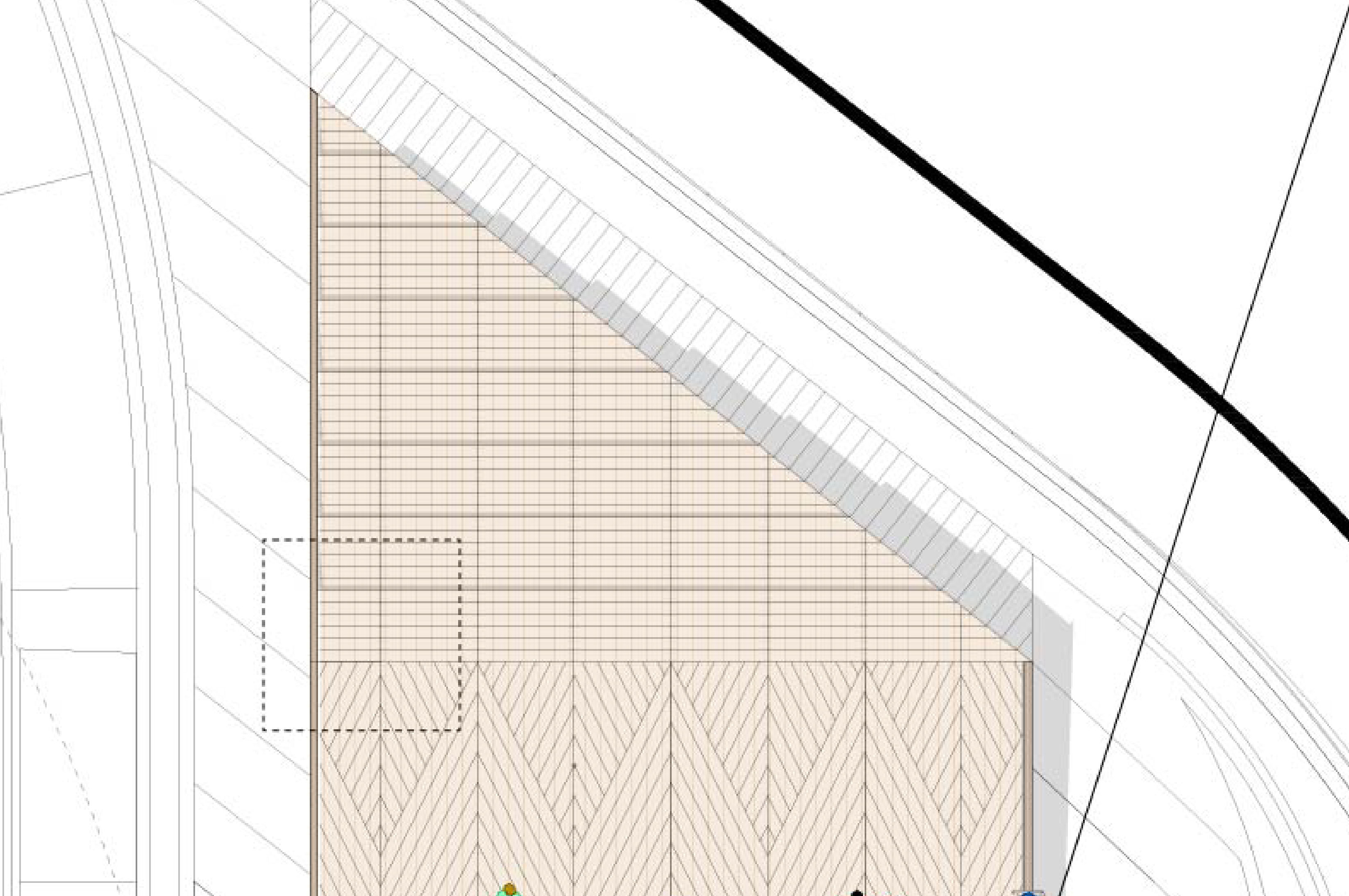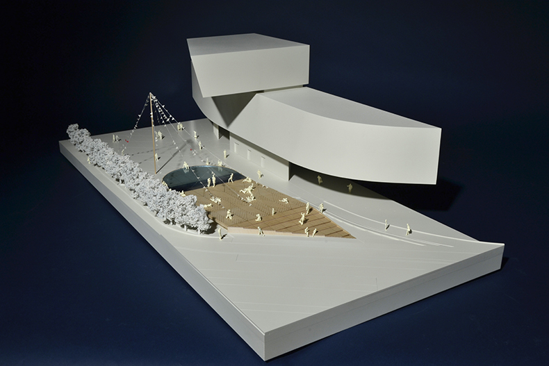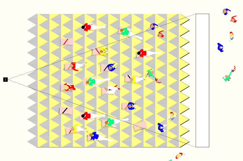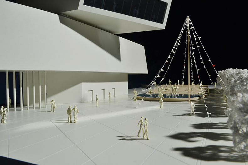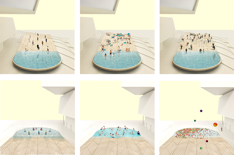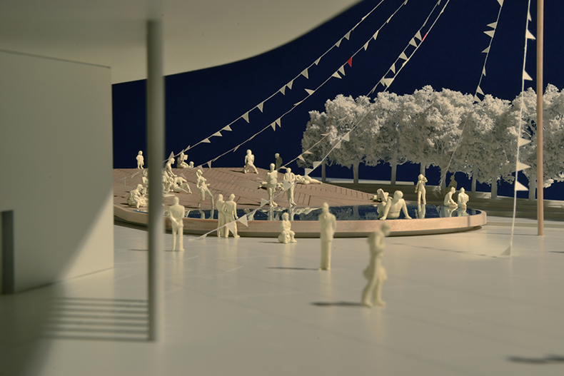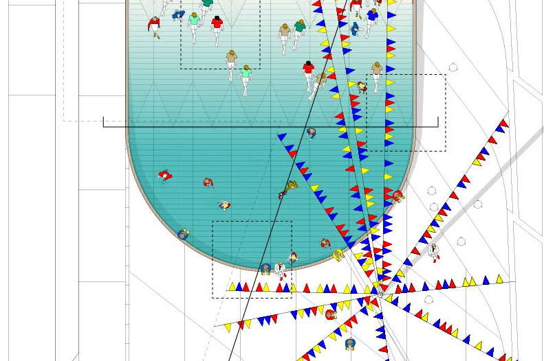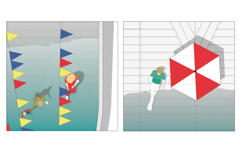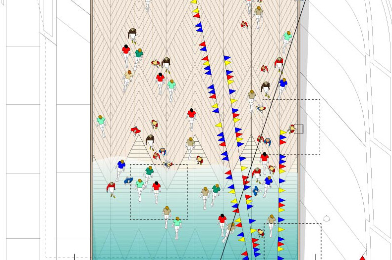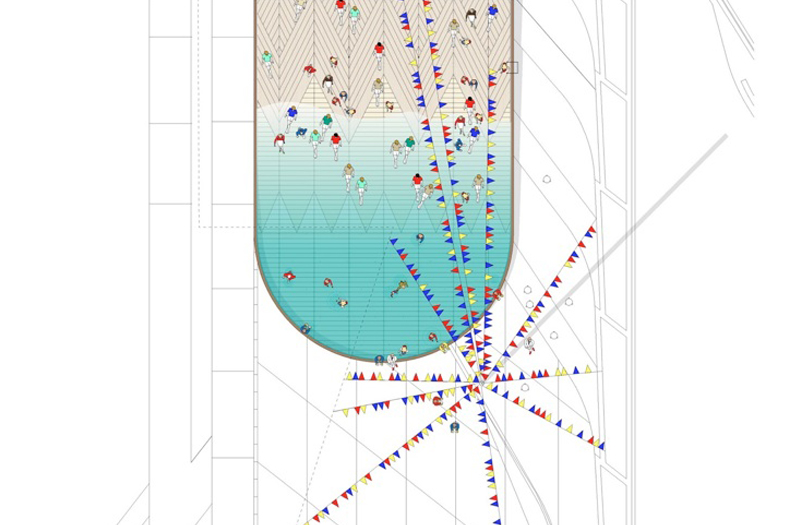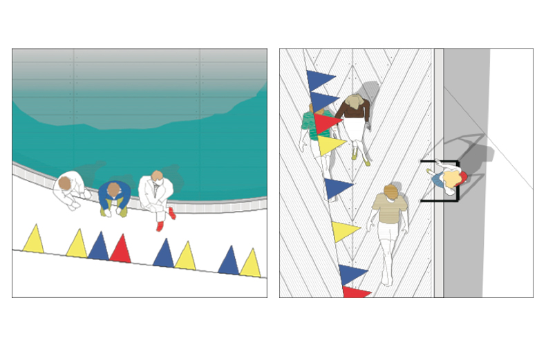 A fragment of reality: Ground Atlas is a Hybrid project. It takes inpiration from public places, both natural and artificial. It recalls a beach in the relation established between water and ground, by its uses and its accessibility. It recalls Italian Piazza usually characterized by stone pavements laid geometrically. On the contrary, the choice of the materials reminds of the temporary and sudden atmosphere of the town feasts, from which it draws ephemeral construction methods and light decorations. Ground Atlas is an imaginary section on the reality, a portion of Italy during the summer months: a square with stalls, a crowded beach with beach umbrellas, a fountain with people sitting on the edges. Ground Atlas, albeit very small, is in between the artificial reconstruction of a natural landscape, a beach, a public urban space, a square, and a revival of a traditional sculptural monument, a fountain. The result is a new place, where no one have ever been. New artificial orizions: A large staircase introduces the visitor to a sloping wooden platform placed on the steps of the Maxxi Museum. The platform turns the steps into a large flat surface that gently declines until it disappears into a square filled with by water. The proposed intervention is hardly visible in section, while the area covered is remarkable. Its surface area is large and immersive and is made to lie down and look up to see who is coming from the front and to look down taking the ncounter between water and wood as an artificial horizon. The platform is visible from the inside of the museum in almost all its extension: the floor outer space of the square then becomes the new landscape. Leaves room for different perspectives and allows the visitor to watch itself and its surroundings. The guest, while lying, revises the image of the courtyard by inserting new characters: the facades of the surrounding buildings, the volumes of the museum seen from below, the fifth in the trees taht line the stsircase teh sky and finally the horizon of wood and water. Ground Atlas is therefore a device (or perhaps a ploy) to immerse the visitor in the square of the Maxxi, making him feel in that place but also elsewhere, ina sort of forced but pleasant ubiquity, where exceptional memories mingle with more everyday memoirs. The visitor lies downa dn remembers the square in front of the Centre Pompidou in Paris and the Piazza del Campo in Siena, reminiscent of the last beach summer vacation and recalls the boat trip to go to Greece the year of maturity. The feast: A moltitude of colored flags visible from a distance, gives the essence of town feast but also the idea of the opening ceremony of a new public space offered to the city.