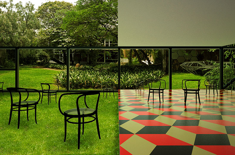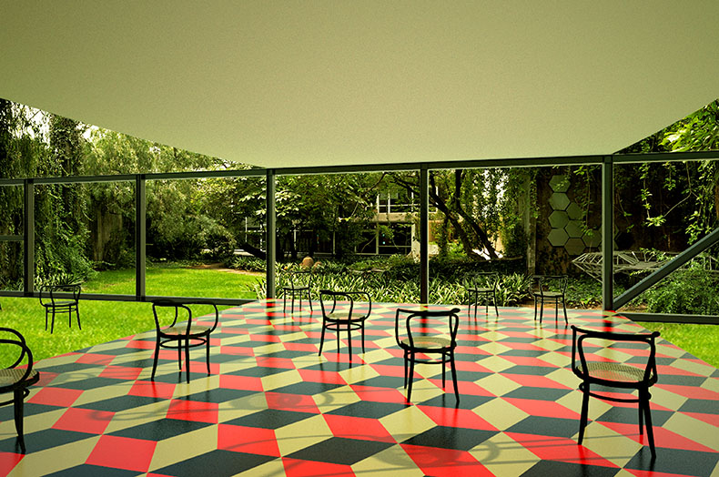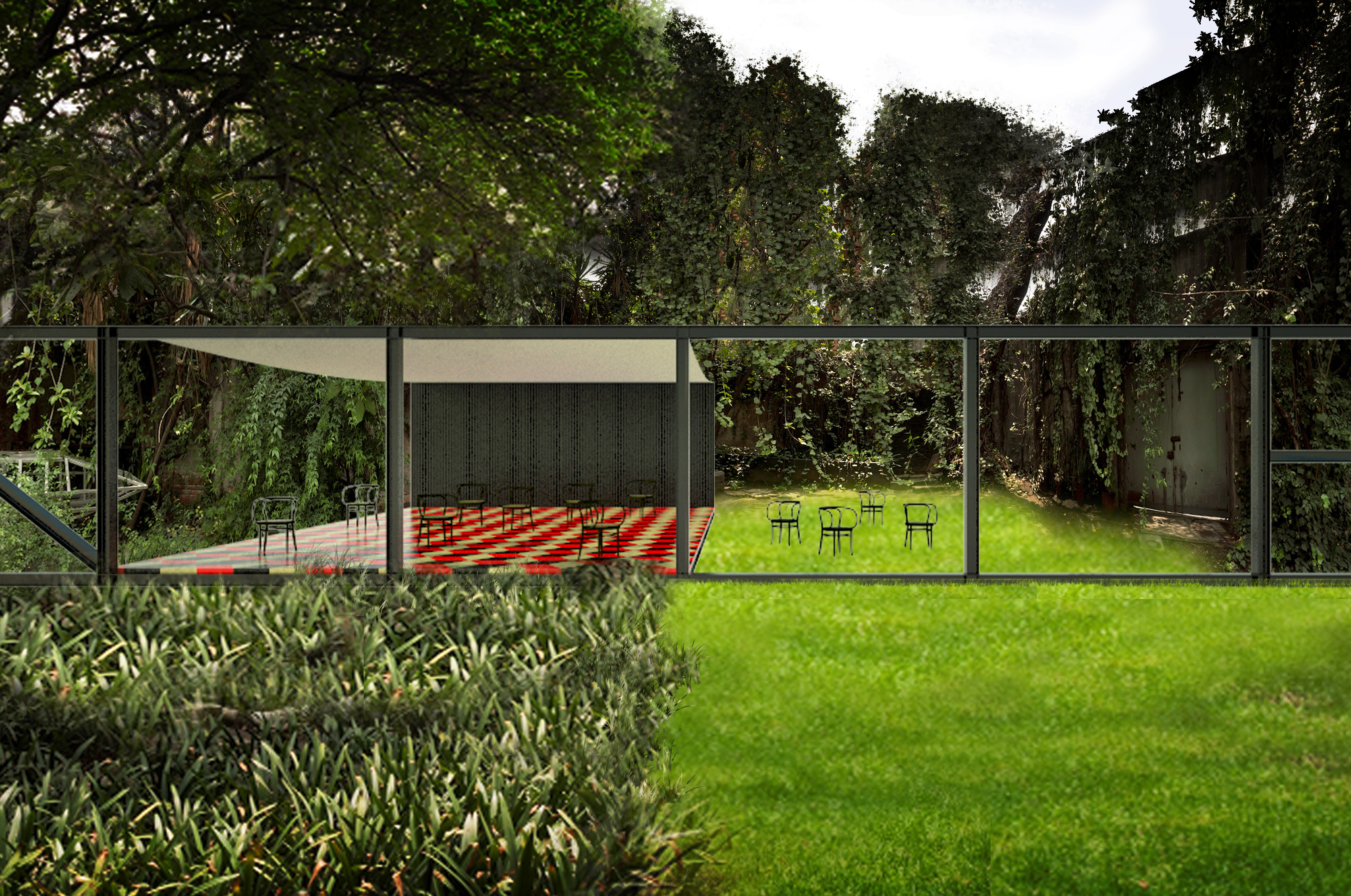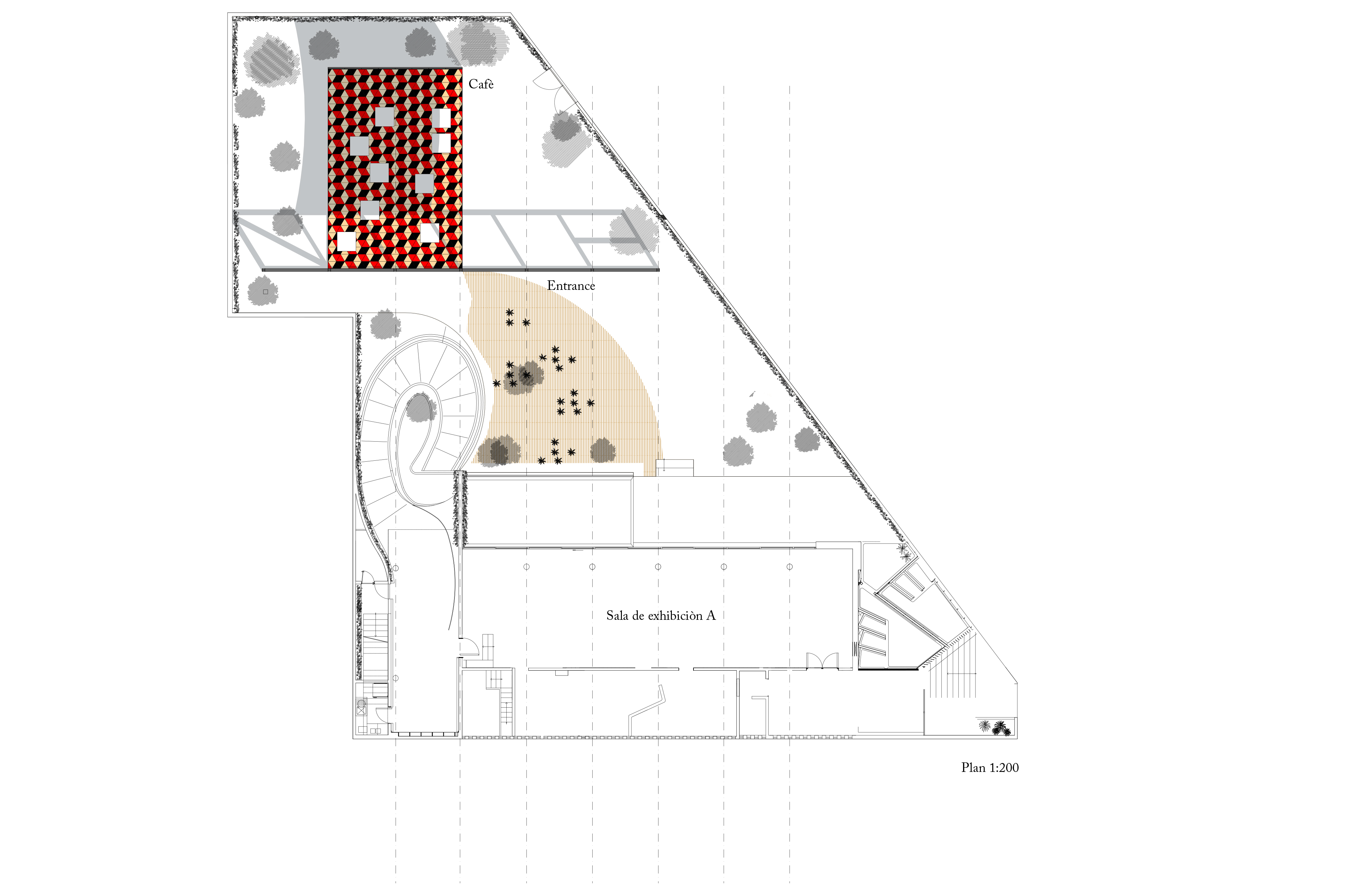 A long frame lies in the middle of the garden and separates the green in two parts. One is closer to the exhisting building and brings on the contact with previous activities. The other is a new private place surrounded by leaves. The pavilion in the garden plays both the role of a scenic background and a stage. It is something in between artificial and natural and allows outdoor technical activities. A curtain filters natural light over the new surfaces and protects from the rain: the soft roof fixes the vertical limit of the pavilion and defines the space. Furniture is spread all over natural and artificial fields, disposable for multiple layouts. Armchairs are both private seats on the green, or public seats for talks under a common roof and added to small tables create coffee layouts. A monochromatic volume stands in the background, hosting space for storage, a bar and a white screen for projections.