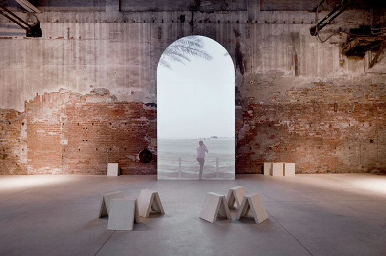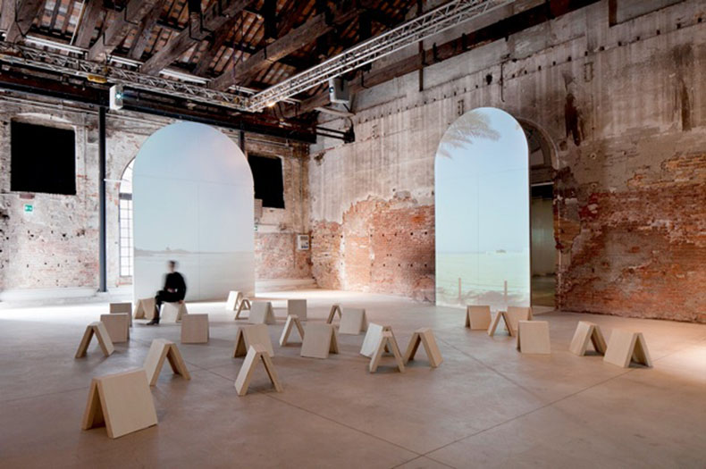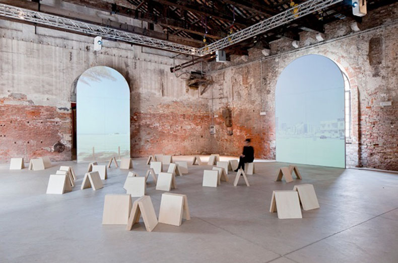 Through seemingly random scenes of Bahraini landscapes, the installation evokes the construction of a collective imaginary of remote places trough theri fragmented appearance in the media and in our living rooms. The normally individual act of media imagery consumption becomes a collective experience shared in the space of the Arsenale, where background imagery of the faraway is isolated and become a sensorial experience. These images add themselves to other images conjured in your head of this place; another set of mental images of a place you might never visit, but that you will certainly construct an imaginary of. The installation shows a landscape transformed by the passage of time, the change of daylight, of seasons and by the succession of different moments of the day. The sensation of being inside a real place, albeit a very far one, gives the installation a quality of pure context; and perhaps offers the viewer an experimental “memento”. Time will simultaneously pass in Venice and in Bahrain. The viewer is part of a long “now” lasting as long as he has the patience to wait. Altrough the locations are but two points in space and time, the projections share one proposed reality.