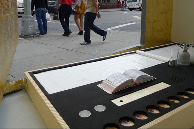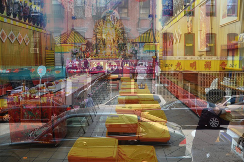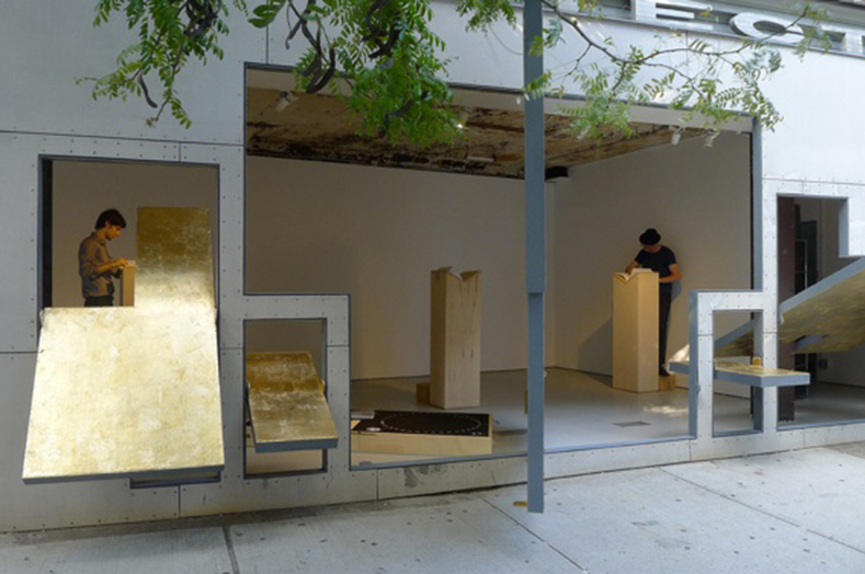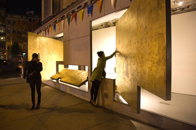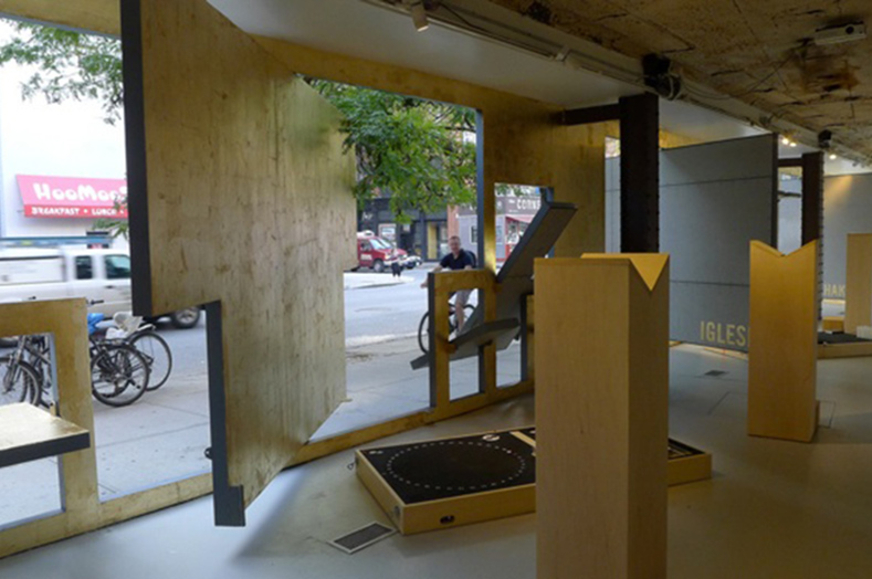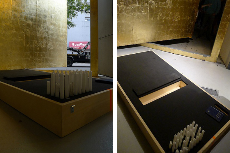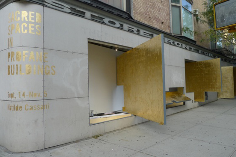 Through analytical and speculative works, Sacred Spaces in Profane Buildings is a public archive and exhibition that explores the impact of religious diversity on the contemporary city and the new, non-traditional spaces in which contemporary religious pluralism manifests itself. The diffusion of new urban religious communities is a central feature in growing contemporary urban societies: until a few years ago, it was thought that the link between public and religious places would gradually disappear as societies gave way to secularity. However, the demand for religious spaces has not diminished, it has simply been altered. Sacred Spaces in Profane Buildings describes the birth of religious architecture and communities as it manifests itself in the contemporary urban context. The project is a transversal investigation of the architectures, policies and multitude of individual acts through which each religion inhabits and transforms the city of New York. As most contemporary western cities, reveals a partial image of its religious landscape. Urbanistically, it either provides an illusion of secularity (through words like "community center") in regard to new religious constructions or presents existing religious buildings prominently as historical artifacts. New religious manifestations through architectural or urban interventions are polemical and only easily allowed in the spaces of the uncharted periphery. However, religious spaces exist in the very center of each community. The archive intends to construct a public archive that explores the urban, social and formal implications of these urban religious practices. An open call for contributions invites the public to submit stories or memories of a visit, a photograph, a location in a map, or anything that might help construct the most comprehensive guide to the sacred unknown of New York. The exhibition as part of Sacred Spaces in Profane Buildings project transformed Storefront's Acconci-Holl façade into a golden wall framing three different series of objects: Taxonomical Readings of the New York Archive; Spiritual Devices; and Symbolic Objects.