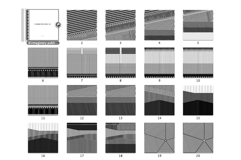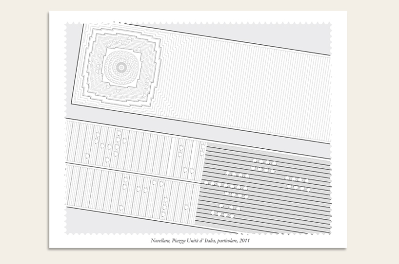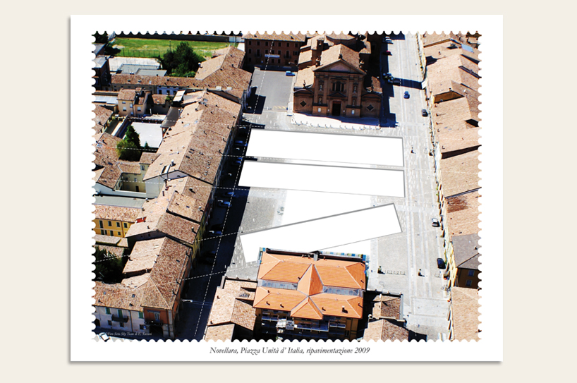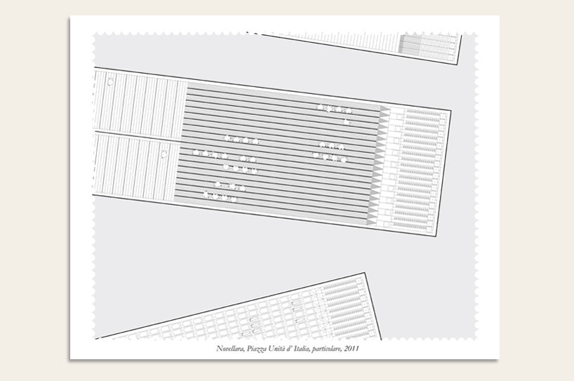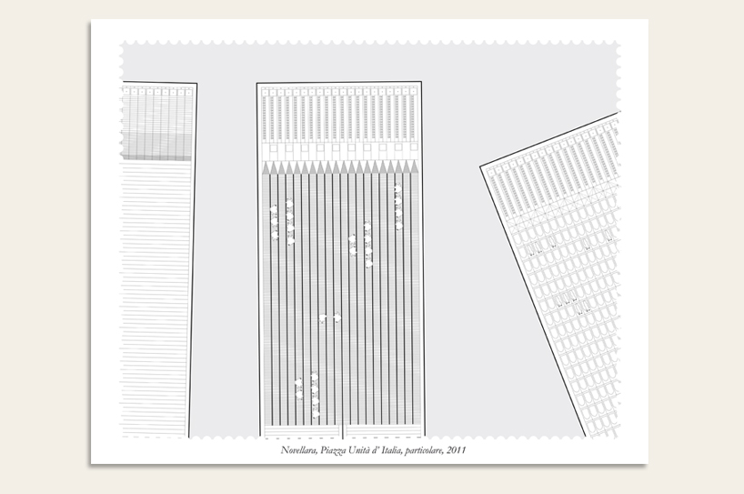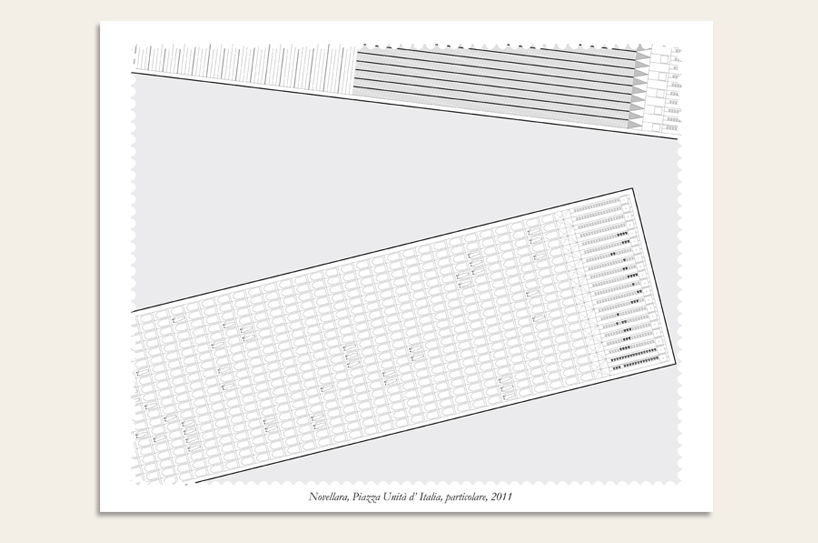 What we see, by examining the physical space that lays between built structures, is a sort of solid memory, the recording of what happened in that precise space in a precise specific moment of a certainits history of a place. This space can be unplanned, or it can be the leftover of stratifications of time and subsequent small interventions, or can be completely designed as well, thereby clearly reflecting its function. Each view is an imaginary portion of the public soil and describes the continual intervention of the men on the field. Each square has an arbitrary boundary being as a partial view of a possibly potentially infinite surface.