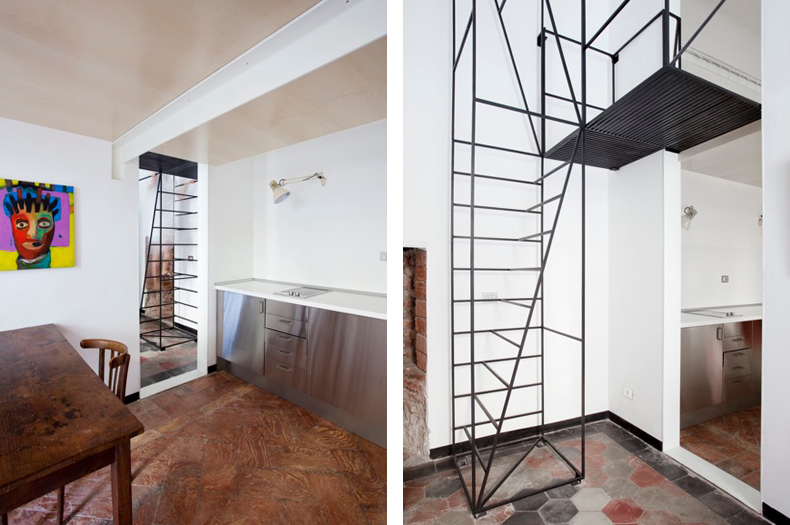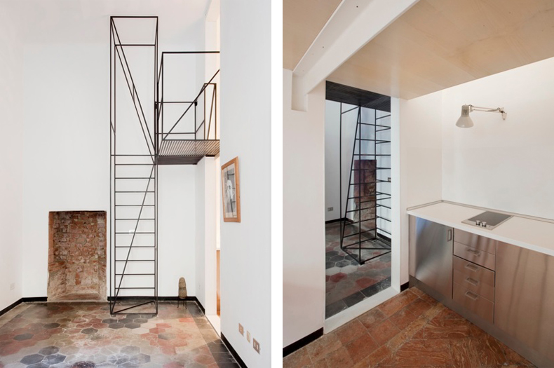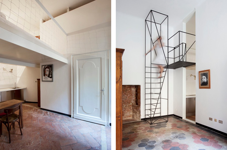 An original 1900 house, where windows, doors and tiled floors survived to modernity. The only possible intervebntion was an almost-2D frame, able to double the space in height and create new possibilities on other layers.