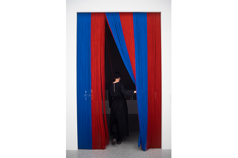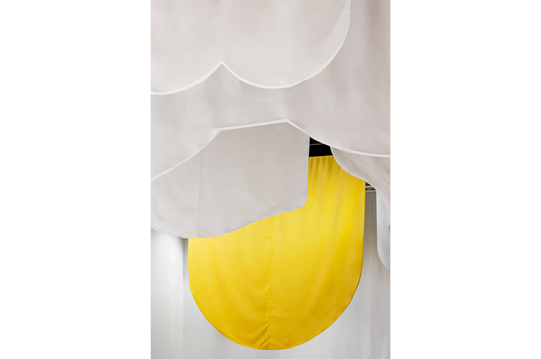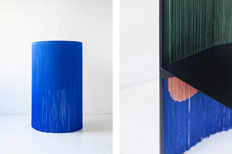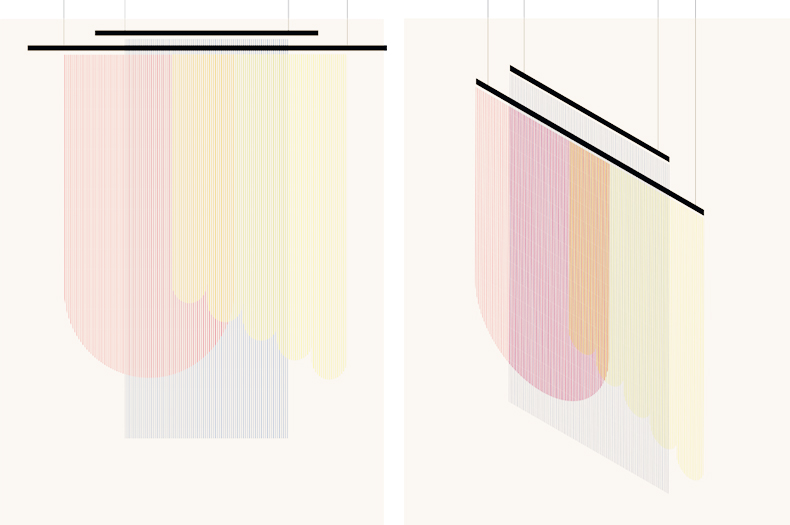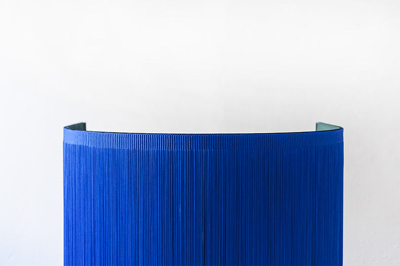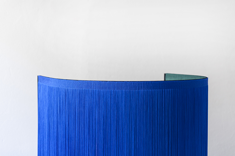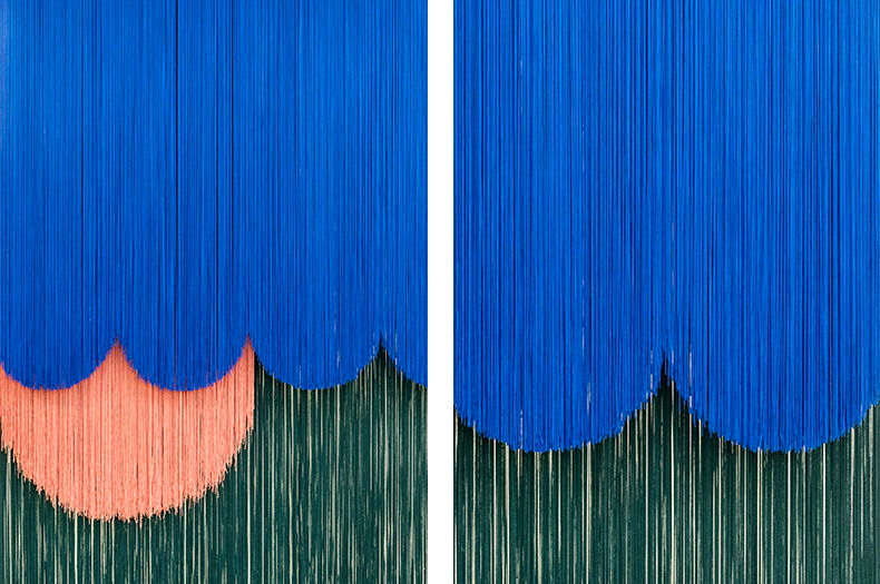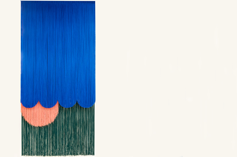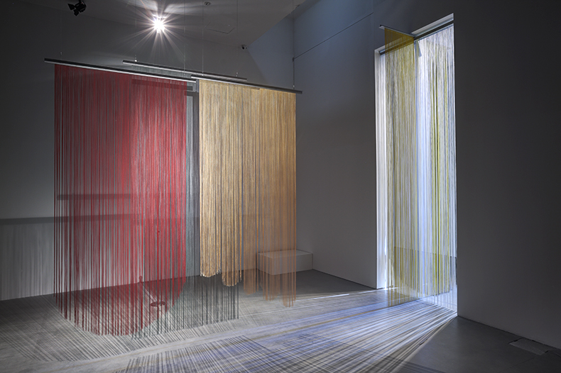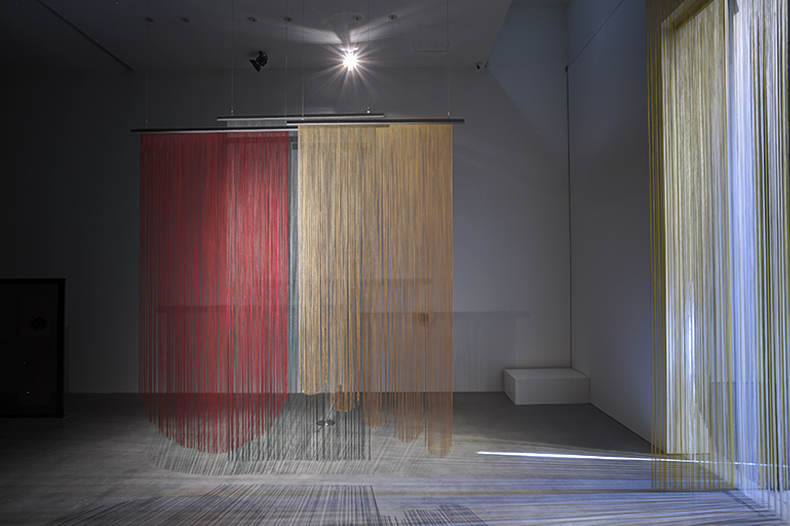 Panorama I and II, create a hybrid, imaginary and mobile landscape, made by color fields. A curtain and a table stage an artificial landscape made of abstract shapes. Curtains, perceived from afar as solid surfaces, dissolve in a sequence of individual threads when the visitor passes through or touches the surface.
