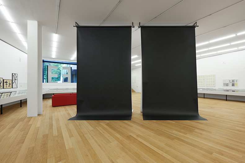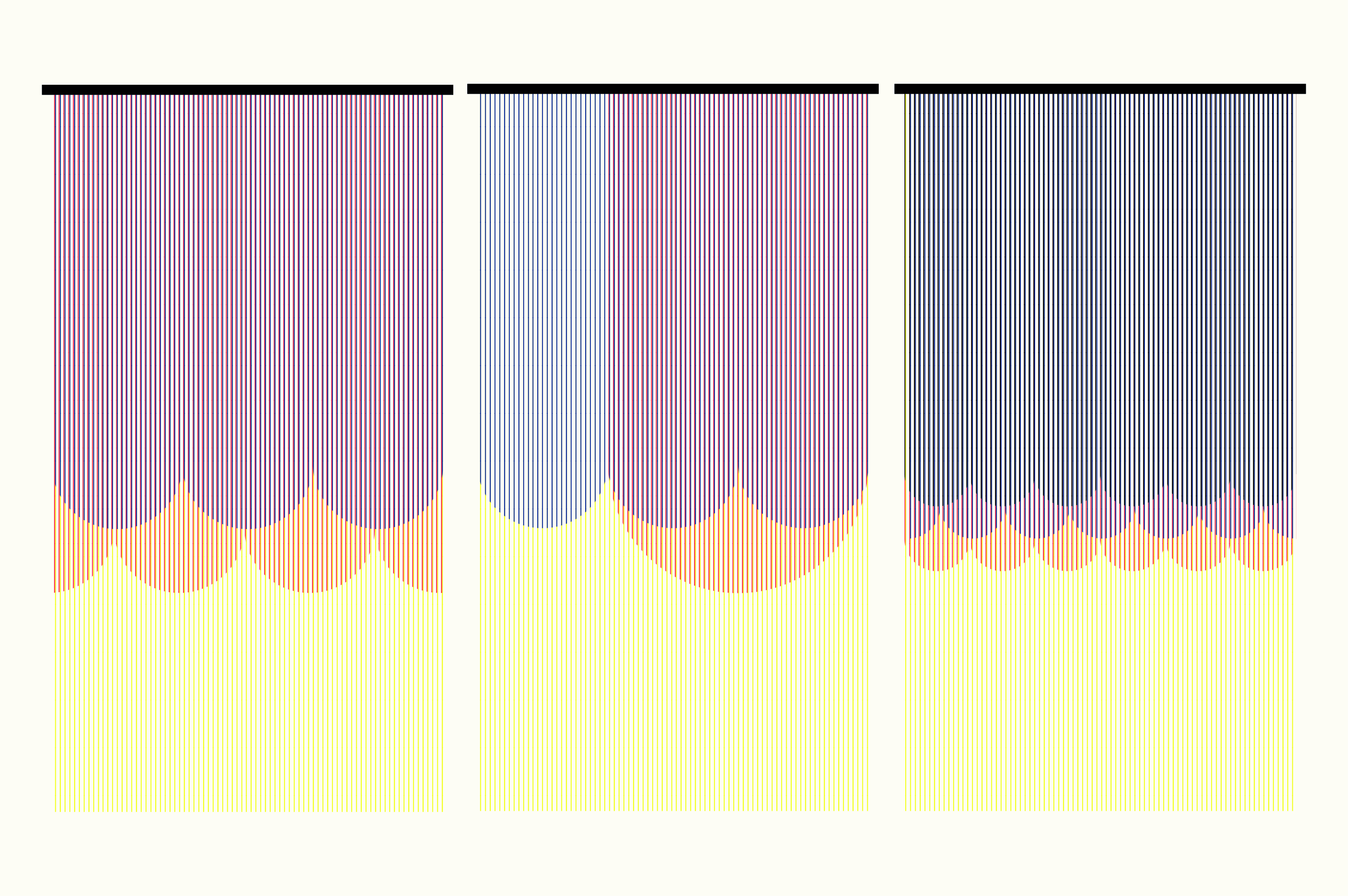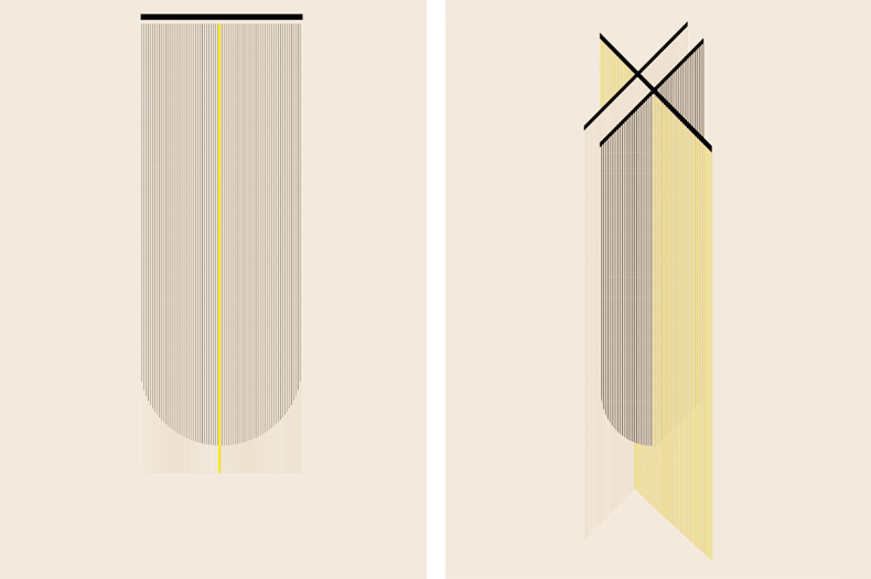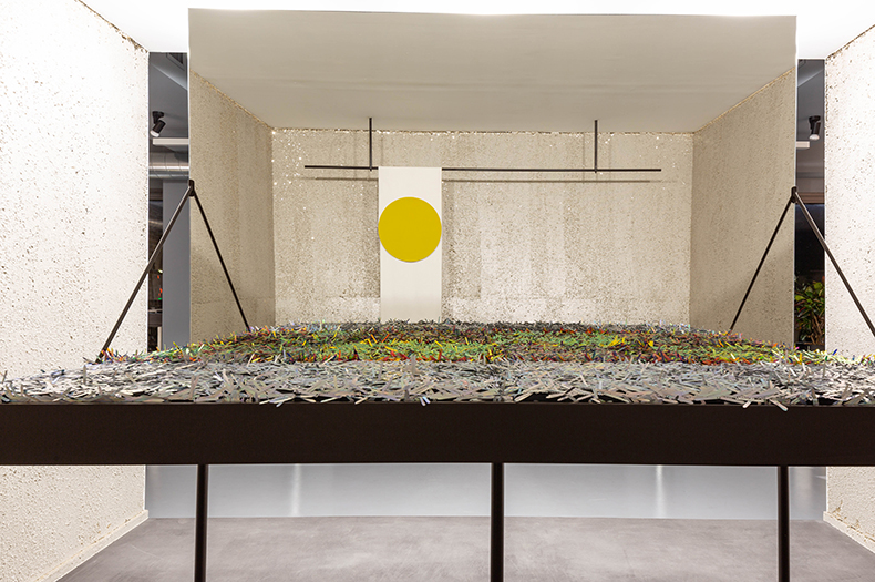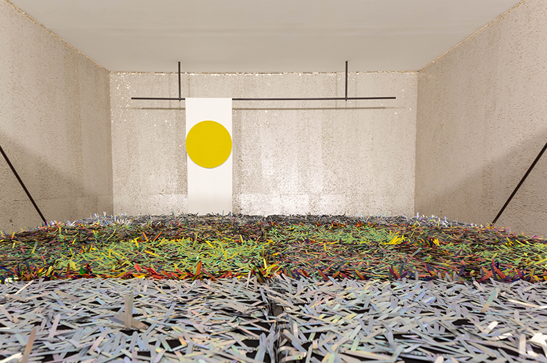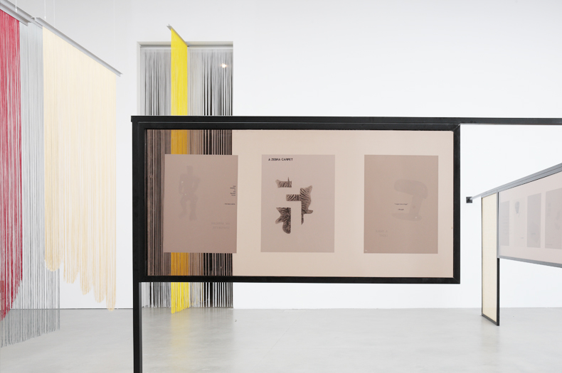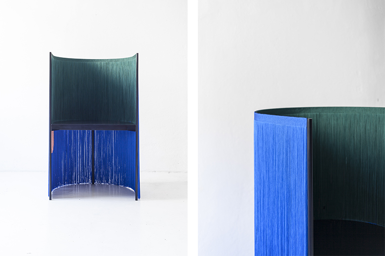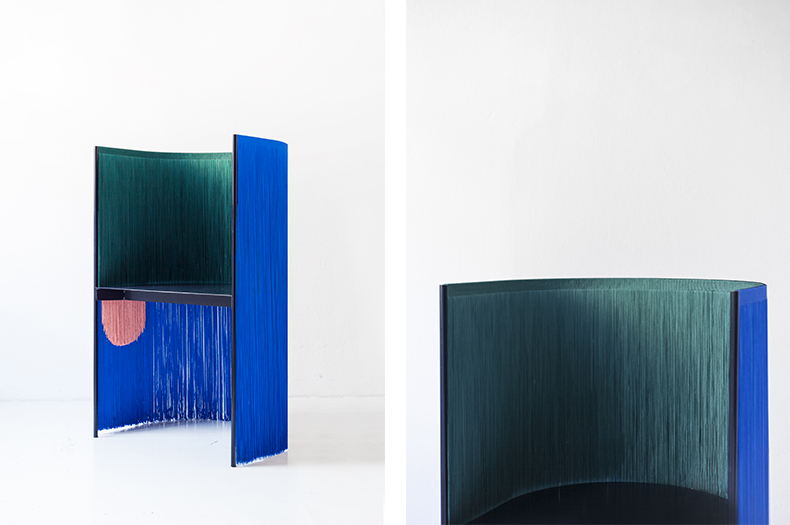 Panorama I and II, create a hybrid, imaginary and mobile landscape, made by color fields. A curtain and a table stage an artificial landscape made of abstract shapes. Curtains, perceived from afar as solid surfaces, dissolve in a sequence of individual threads when the visitor passes through or touches the surface.