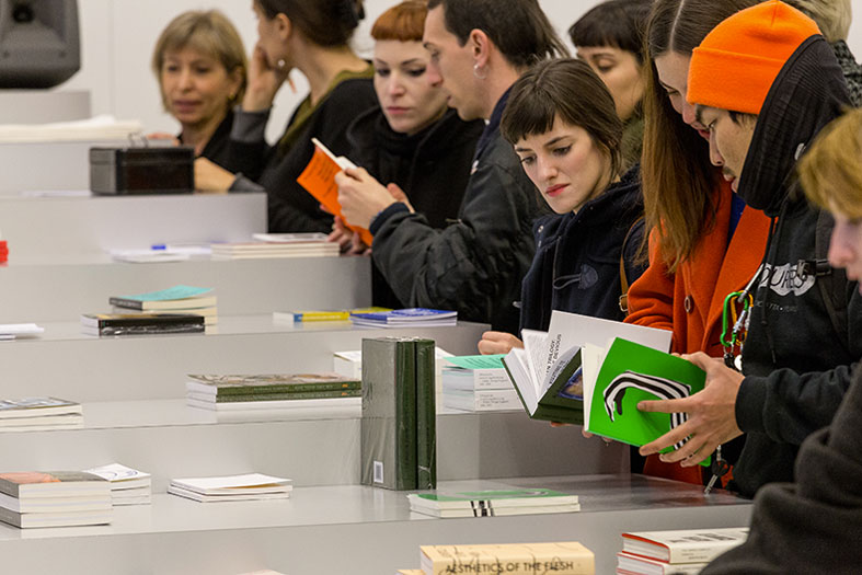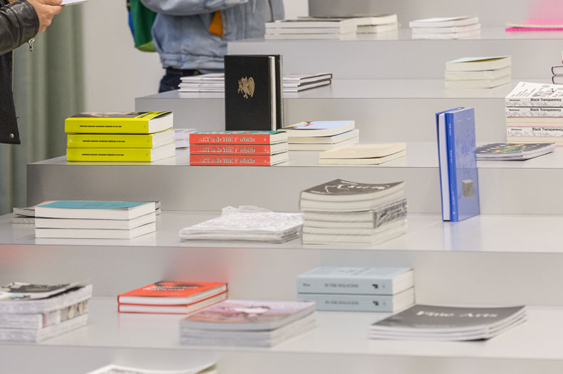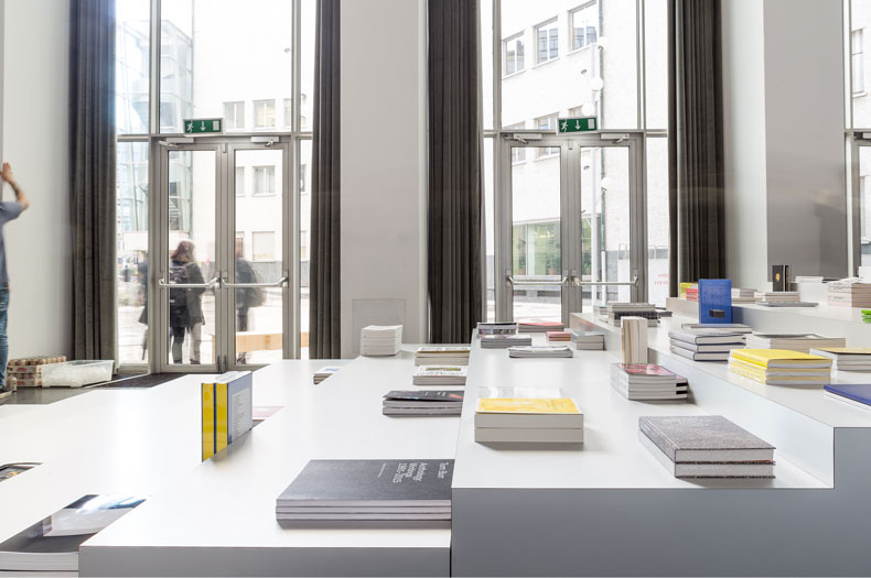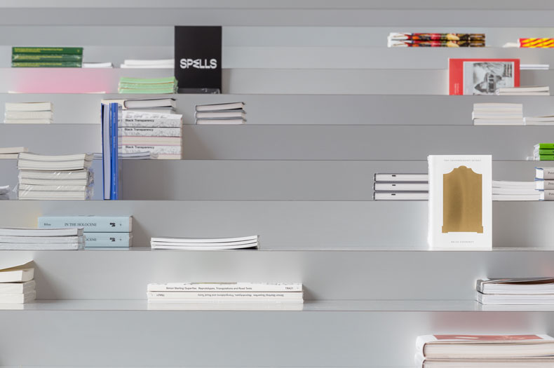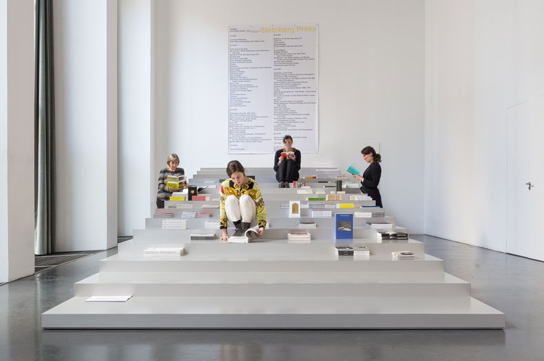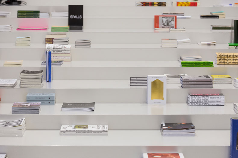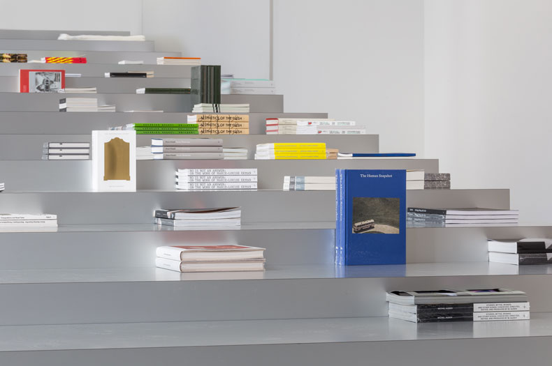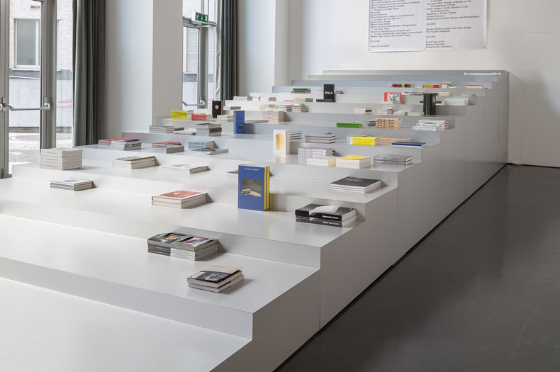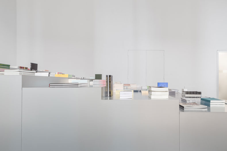 For four months the exhibition space of Istituto Svizzero in Milan will be inhabited by the temporary bookshop RIVIERA. Here the time and space of exhibitions and reading will cross, contaminate and interfere with one another to become a place crossed by many possible trajectories and histories, addressed each time through a precise selection of books and exhibitions connected with graphics, design, fashion and the visual arts. RIVIERA is a project developed in collaboration with Caterina Riva and Dallas, in which books are the protagonists: as objects, contents, forms, pretexts, obsessions, collectibles or curiosities, mirrors, obstacles, mirages. The bookshop, organized in collaboration with a+m bookstore, will offer a stock of titles that increases over time, becoming the fulcrum of a versatile period containing different appointments: presentations, interventions, performances, sales, exhibitions. The installation by Matilde Cassani, like a flight of steps, offers the infrastructure and setting that will fill up and empty like the tides, to contain publications, works and visitors, transforming each time, balancing the functions of audience space and stage space.