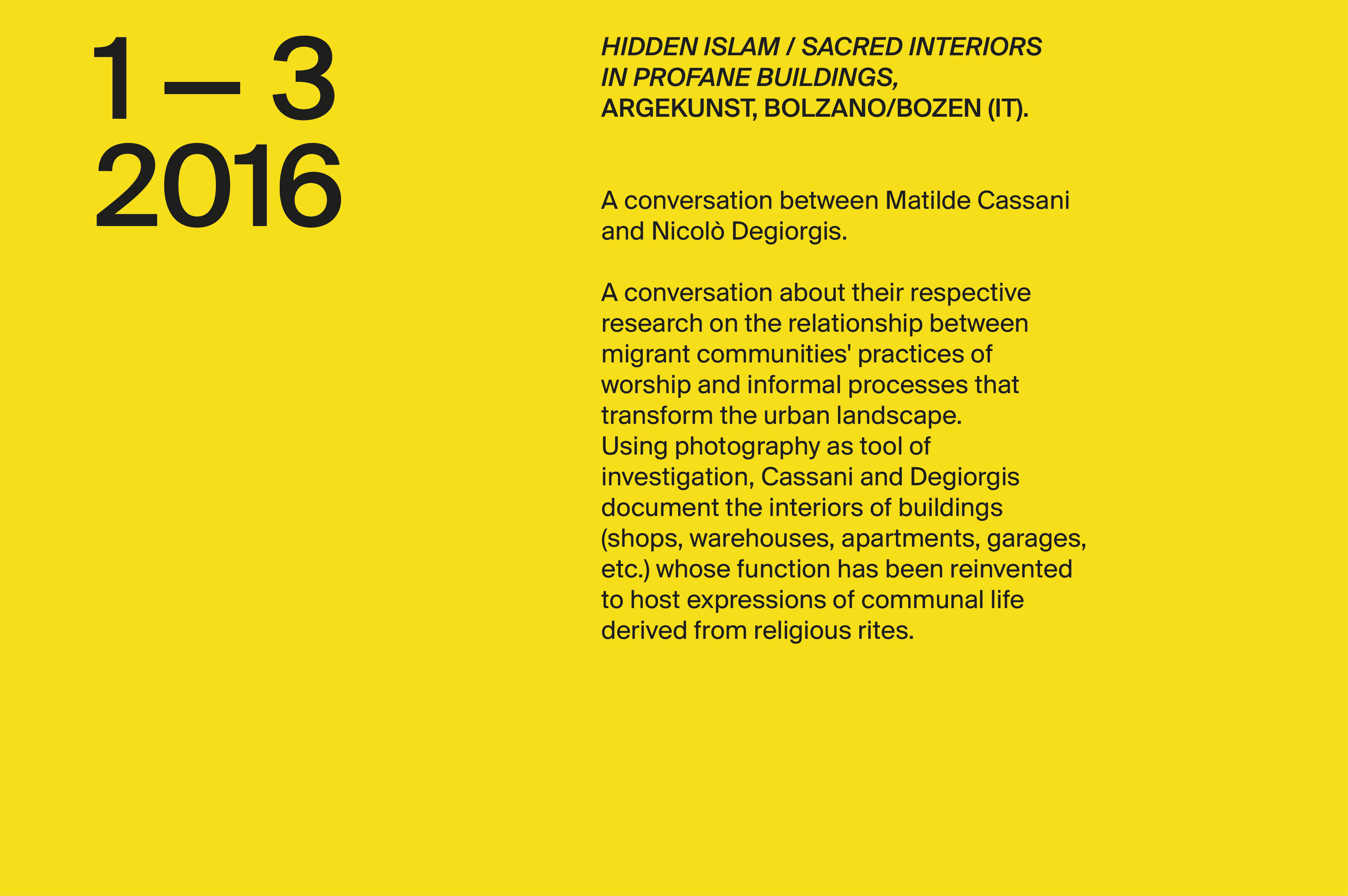 "Sacred Interiors and Profane Buildings" is a recent piece of research by the Italian artist Matilde Cassani inspired by the dilemmas of Europe in relating herself to her non-Christian immigrants. She mapped out the sacred places of Muslims, Singhs and Buddhists in Barcelona, which mostly occupy unexpected and inconspicuous locations such as empty, unused shops or garage extensions. These spaces are transformed according to the needs of the community performing its religious duties inside. Cassani’s research maps out one of the important frictions in European countries that on the surface seem to tolerate the differences but in actuality leaving no space for differences to appear in their usual order. Furthermore, she points out the survival instincts of global communities. Sacred Interiors and Profane Buildings manifest the ridiculousness of the mentality of "Minarett-Attack" in Europe today. Ovul Durmusoglu