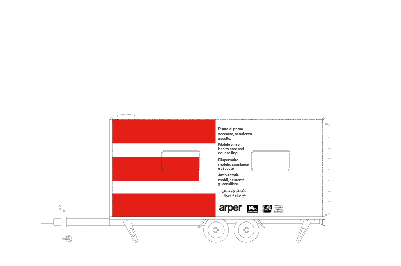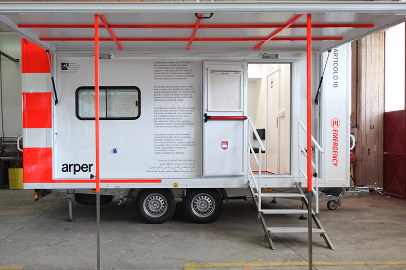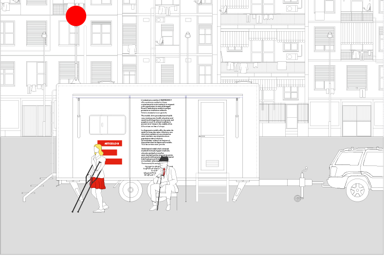 Article 10 is a project that provides basic health care through the EMERGENCY Association. The device includes a basic outpatients clinic and a waiting room, sheltered and shaded, on the outside. A system of overlapping curtains provides shade in summer and insulation in winter. During the night, a bright sphere illuminates the surrounding area, enlarging its field of action to a public space and indicating its presence even at a distance.