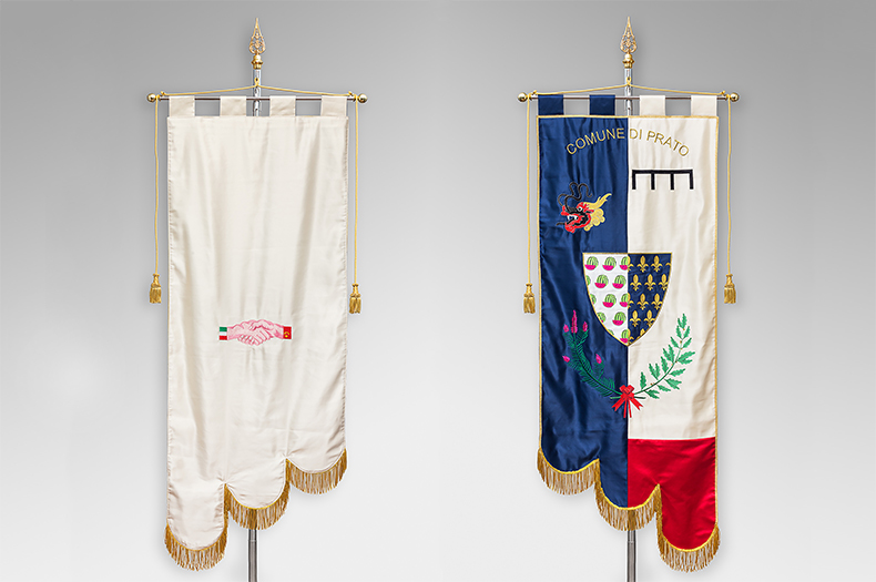 The gonfalon, gonfanon or gonfalone (from the early Italian confalone) is a type of heraldic flag or banner, often pointed, swallow-tailed, or with several streamers, suspended from a crossbar in an identical manner to the ancient Roman vexillum. It was first adopted by Italian medieval city councils, and later, by local guilds, corporations and districts. A gonfalone normally includes a badge, or coat of arms, and ornamentation taken from the local collective memory. Its overall layout is generally fixed, according to strict heraldic rules, common to every city, while the content and the symbols, vary according to the specificity of the place. Today every Italian municipality has a gonfalone which reflects the identity of the city and is regularly used in any official occasion: ecclesiastic ceremonies, processions, university ceremonies, town feasts and even weddings. We proposed to organize a worshop with the aim to re-think the Gonfalone, traditional symbol of identity for every italian comune. The event’s goal was to try to re-design a new urban interpretation of Prato, using, as a starting point, the existing one and its heraldic language. Building on the existing illustrations, we discussed how to re-actualize it, in accordance with the changing needs of the contemporary world, the new local identity and the collective memory. A number of representatives of the local institutions, were called upon to design a new symbol for the city.