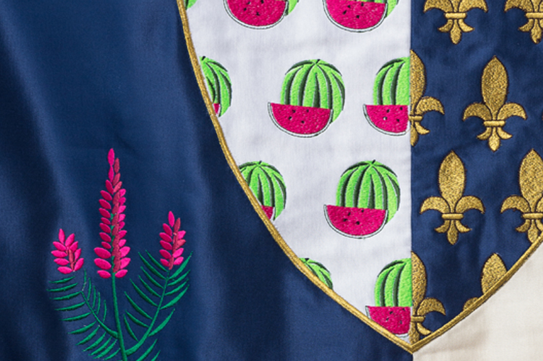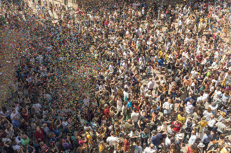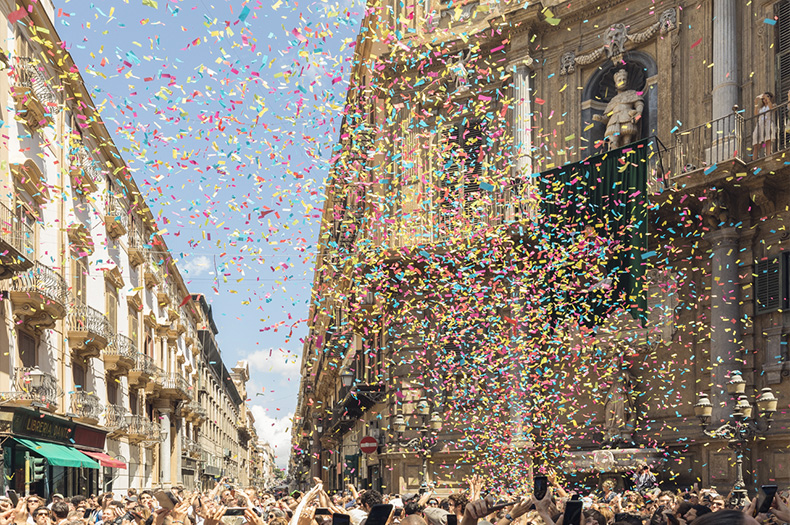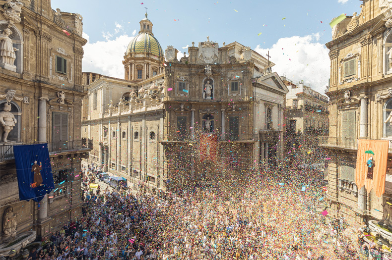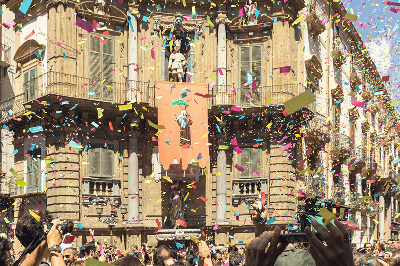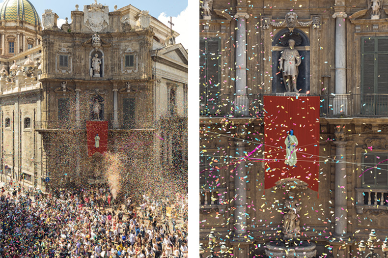 Tutto draws on Sicilian baroque traditions and updates them by revealing the complexity of the new and different cultural inputs the city of Palermo experiences today. Four embroidered drapes, display four figures of saints, originally christian, carrying new and updated symbols. The project takes inspiration from the specifically Palermitan case in which there's a sincretic relationship between christian and hindu tamil communities. Santa rosalia, the city patron saint, and her rituals are participated by both communities.A daytime firework display, specifically designed for Quattro Canti in Palermo, blasts a series of colourful slips of paper with messages and images into the air. After the explosion all the pieces shot into the air slowly descend, dropping on the heads of the spectators, remaining partially attached to the facades of the surrounding buildings, clinging to a series of ropes connecting the buildings, and finally falling to the ground. The embroidered cloths, a selected number of paper slips and a photograph of the event are hosted in Palazzo Costantino, acting as a reminder of the celebration and becoming a collective memory for Tutto. The installation takes its cue from traditional Sicilian baroque events and engages the local residents, suggesting an official day of celebration to be added to the city’s calendar of festivities. The work focuses on the idea of celebration as a tool to describe a wider system of political, social and cultural environments.
