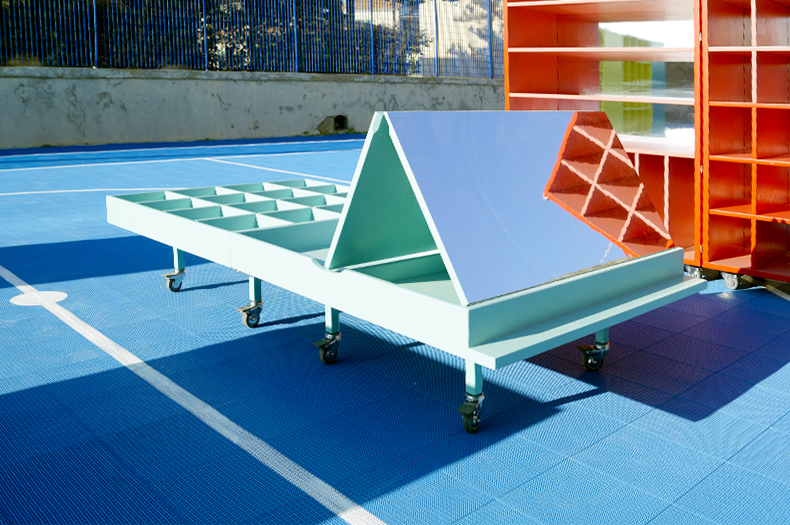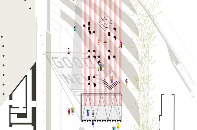 Good News is a covered square, a stage for events and a landmark. A thin colorful tent shades the steps of the courtyard of the Maxxi Museum, offering to the visitors a comfortable indoor space. A large rectangular iron frame, which supports the tent, contains a stage designed to host events organized by the museum and other occasional performances. A large illuminated “Good News” text, dominates the scene, as if to ensure the good mood of the passers-by. The good news bright sign is an unexpected positive message that subverts the expectations of the visitor. If public space is generally full of prohibitions and warning messages, in this case the audience will be surprised by an encouraging message.