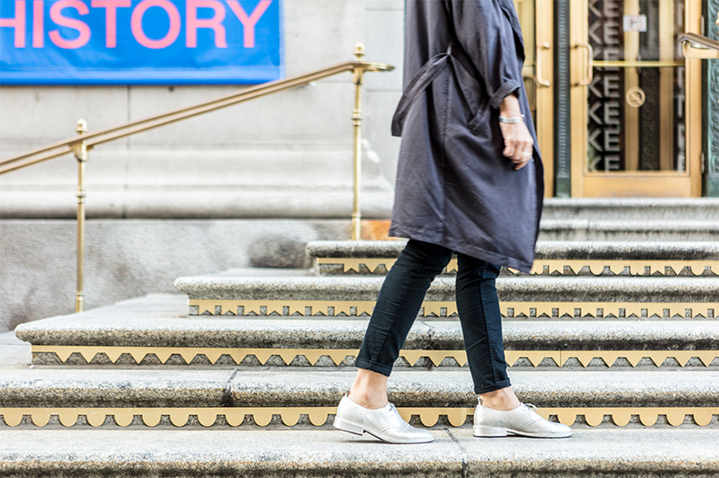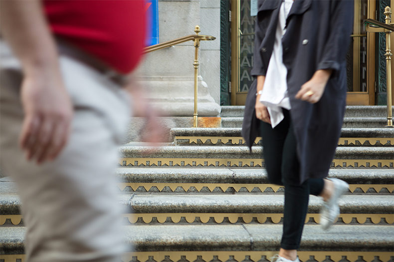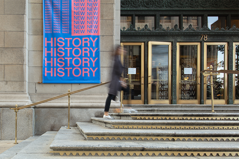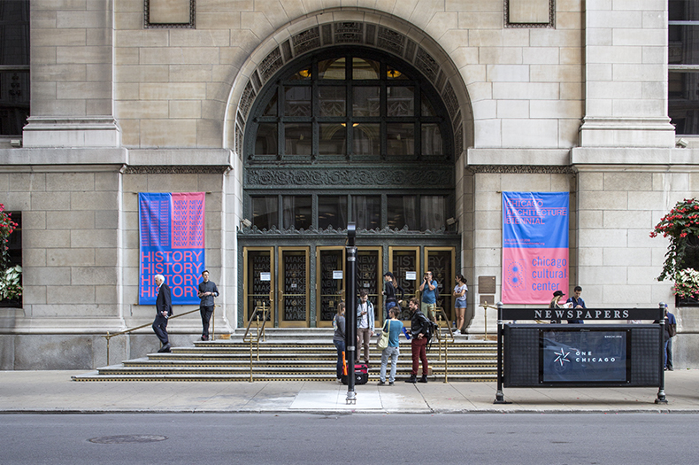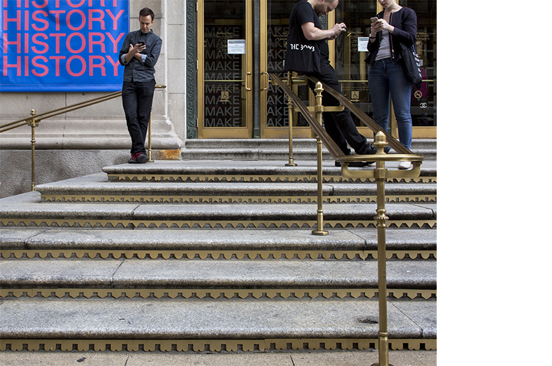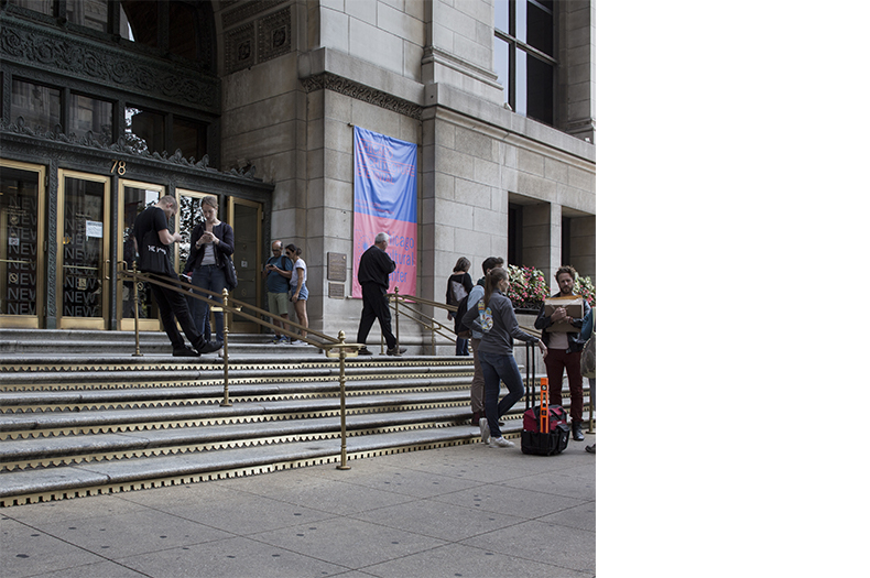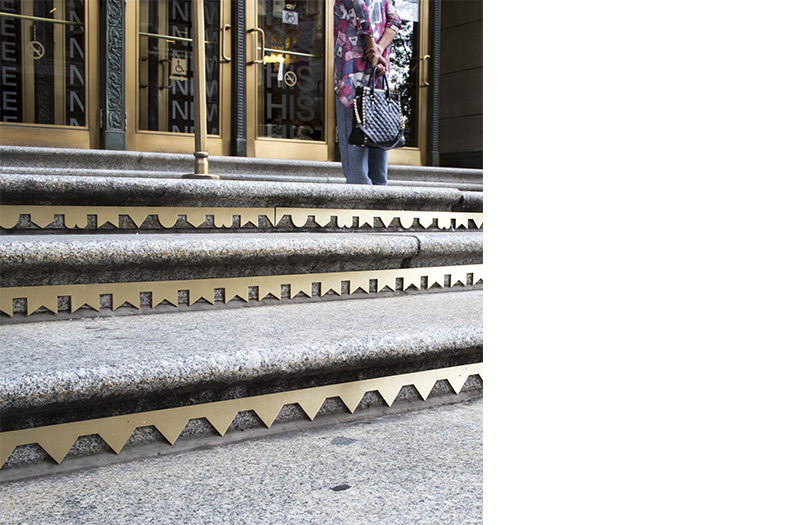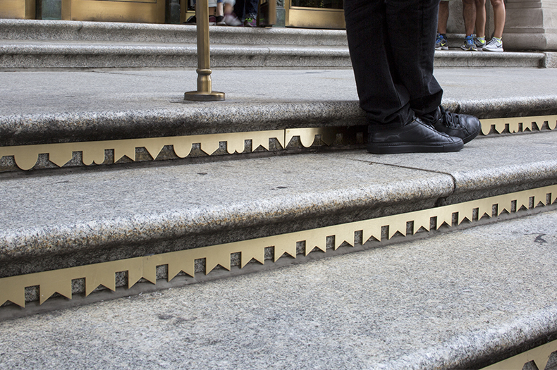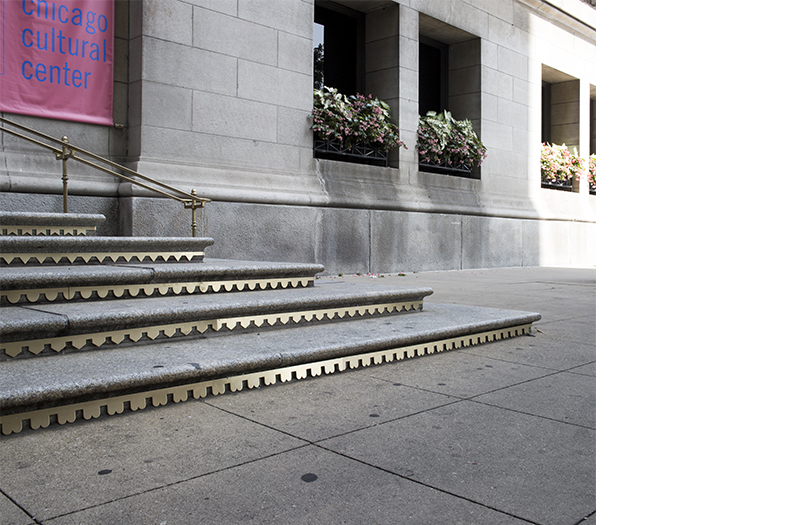 Ornament is a set of brass strips which adorns the entrance of the show in Washington Street. The granite stair is decorated with a series of Greek frets which recall the decorative elements found in the interiors of the Chicago Cultural center. The installation refers to the stair of Santa Maria del Monte in Caltagirone, Sicily. Made of 130 steps, the stair includes a series of raisers inspired at different architectural styles (from Renaissance, passing trough Baroque, until the 1800) and can be intended as a travel trough the history of architecture. Ornament indulges and highlights the mixed style nature of the interiors and the facades of the Chicago cultural center.