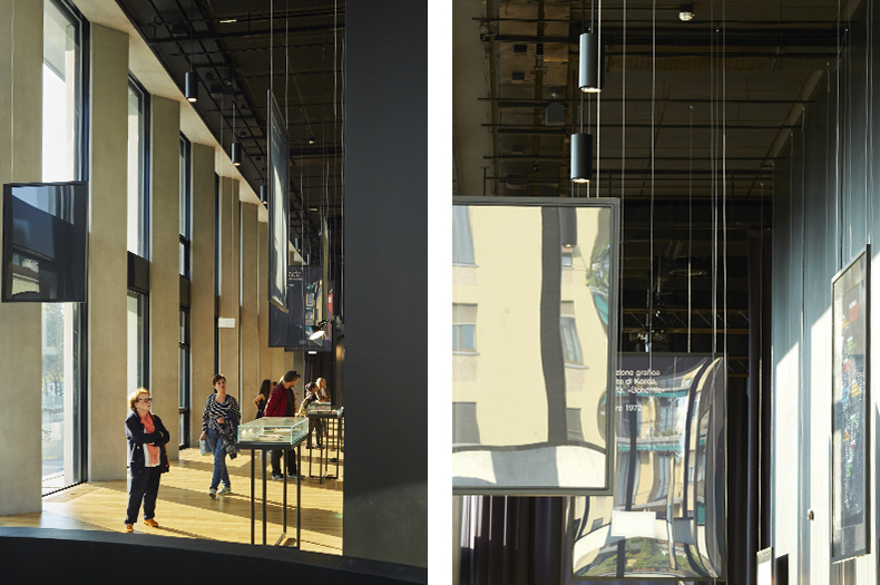 A series of displays showcase the large Archive of the Feltrinelli Foundation and make it accessible to a wider audience. Visitors can experience the history of the collection inside the brand new headquarter. The exhibition system doesn’t impact the scheduled activities but merges with them by letting people experience the history of the collezione during their visit. The exhibition design features a series of modular and flexible displays able to showcase a wide range of objects. Suspended steel cables hold the entire set-up.