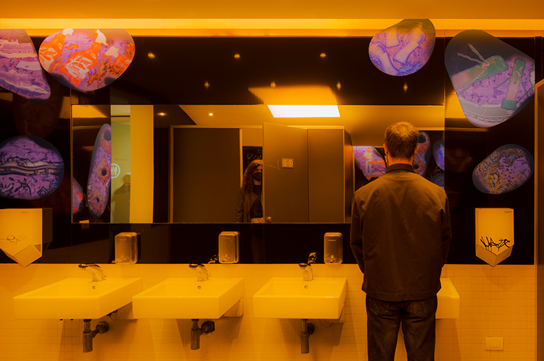 When we enter the restroom, we are never alone. Instead, we are entangled in a network of bodies, infrastructures, ecosystems, cultural norms, and regulations. In the Restroom Pavilion, some nodes within these networks are explored as they specifically materialize within Venice—a city that reveals itself as a constellation of mutually dependent environments and distinct geographies. In the Pavilion, a number of flags celebrate these networks in lieu of typical bathroom signage. Inside, a new materialization takes the place of the tiling that typically sustains modern and contemporary ideals of hygiene in the architecture of restrooms. If these ideals have typically operated through the creation of increasingly isolating and discriminatory practices, the Restroom Pavilion provides an inclusive description of the realities within which restrooms exist. In the restroom, we always live together.