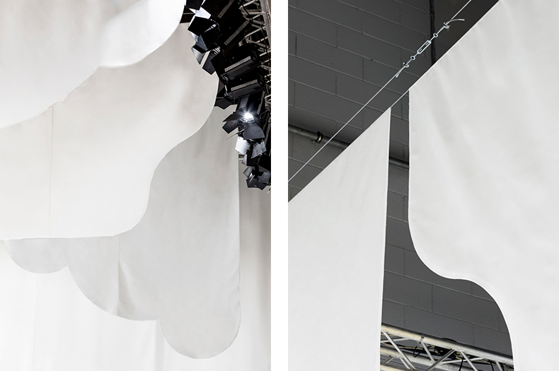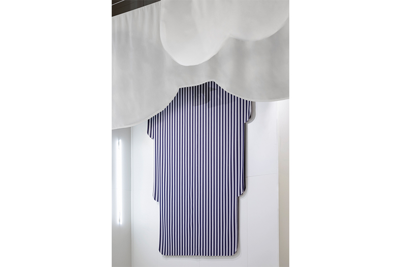 The Campeggi pavilion is an enormous drying rack on which a series of fabric silhouettes hang, just like in Venice. The historical forms of the entire collection can be observed in a succession of perspectives. The longer side displays the clothes hanging sideways and is formally rigorous. The shorter side reveals a perspective breakthrough, typical of theatrical wings. A landscape of ideas hanging under the sun.