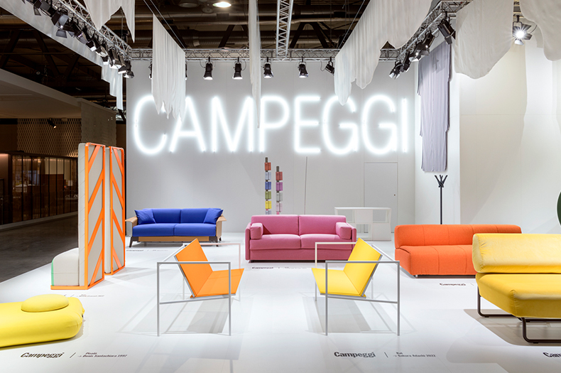 Stendino Campeggi, 2022 Exhibition: Stand Campeggi designs Design: Matilde Cassani Studio (Matilde Cassani, Leonardo Gatti) Graphic design: Italo Lupi Studio Graphic design communication Alessio D’Ellena, Superness Location Salone del Mobile 2022 Photos Giovanni Galanello