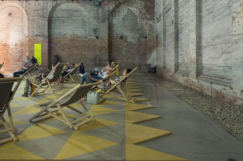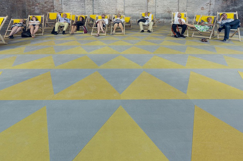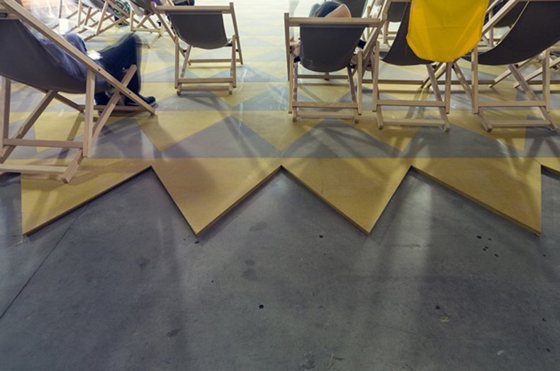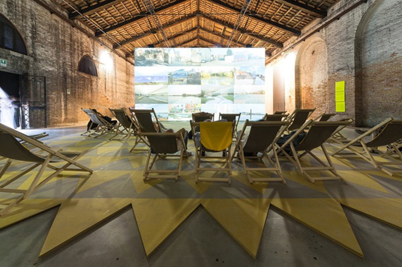 The Italian Pavilion at the Venice Biennale 2014 launched the open call Inhabited Landscapes/ Paesaggi Abitati. The exhbition features a series of professional and amateur videos displaying the complexity of the italian landscape. The result is a mosaic of 1 minute videos which document the italian urban space, its inhabitants and the everyday small modifications happening troughout the contry. Floor is a public infrastructure, able to host and embrace the audience, tired after a very long walk from the entrance to the very far Italian Pavilion located at the end of Arsenale.