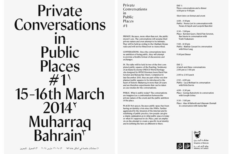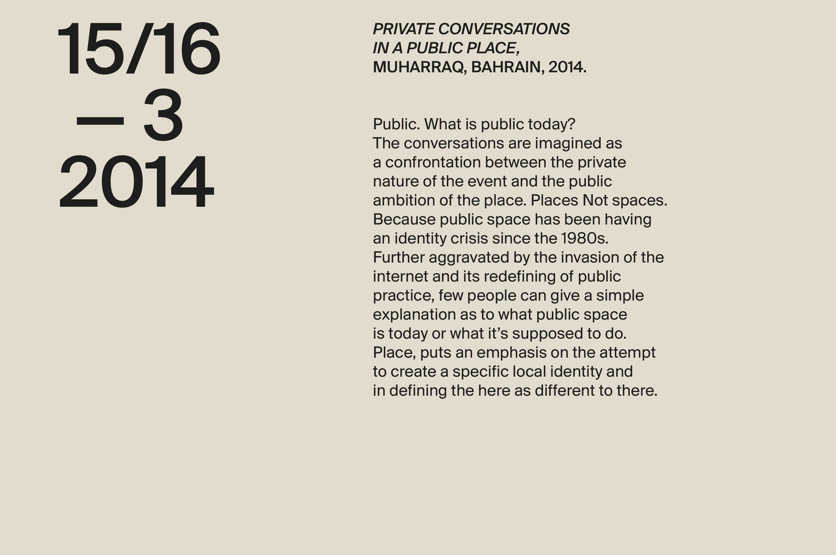 Private. Because, more often than not, the public doesn’t care. The conversations will assume their private nature and even attempt to be intimate. They will be held according to the Chatham House rules and will not be filmed nor re-transcribed. Conversations. Since the conversations have no ambition of being public, they will attempt to provide a flexible format of discussions and exchanges. In. The talks will be held in two of the first completed public squares of the Pearling, Testimony of an Island Economy UNESCO World Heritage site designed by Office Kersten Geers David Van Severen and Bureau Bas Smets. Completed in late December 2013, they are part of the very few planned public squares to be introduced to the heart of historic Muharraq in more than 20 years and are therefore experiments that can be taken as case studies for the conversations. Public. What is public today? The conversations are imagined as a confrontation between the private nature of the event and the public ambition of the place. Places Not spaces. Because public space has been having an identity crisis since the 1980s. Further aggravated by the invasion of the internet and its redefining of public practice, few people can give a simple explanation as to what public space is today or what it’s supposed to do. Place, puts an emphasis on the attempt to create a specific local identity and in defining the here as different to there.