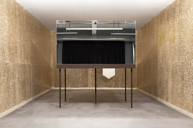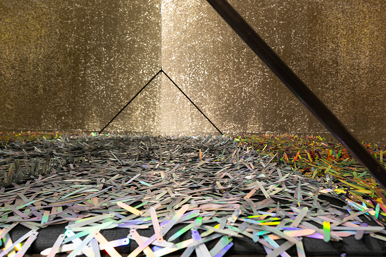 WELCOME, welcomes the public to the show. It is at once a point of view, a decorated entrance and a celebration of movement in space. WELCOME is concerned with how bodies perform the function of a physical space through how they use and inhabit that space, revealing how a space becomes a place, only in the moment in which a ritual is performed. Physically, the threshold itself can be perceived initially as a solid, geometric shape, made of tangible shiny surfaces, that dissolve into thousands of individual threads the instant the visitor crosses through. The shape of the work is drawn from the form of a curtain, relating to the collective memory of old grocery shops, Southern Italy ground floor interiors and the background of a stage show. The visitor, crossing the entrance could instantly reconstruct a scenario made of sudden revelations, food smells, domestic interiors and the expectation for a show that is about to begin.