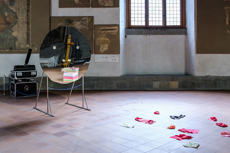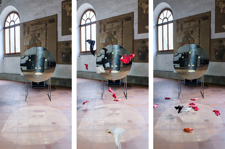 The exhibition “Il Dono. Tra la vita e la morte” takes as a point of departure from the Essai sur le Don ('The Gift’). Through historical works and new commission, the show investigates the theme of the gift, pushing it towards the two dialectical boundaries that determine the existence of every man: life and death. If “truth” remains the most discussed and indefinite theme in the contemporary world, the piece “La Bocca della Verità” questions the idea of truth, considering it as the true gift. Loosely inspired by the historic Roman “Bocca della Verità”, the large metal mask observes the viewer and, by mirroring him, confronts him. The mask releases into air silk handkerchiefs embroidered with his effigy. Once fired out of its mouth, they whirl around the room and finally land on the ground as an offering to the viewer.