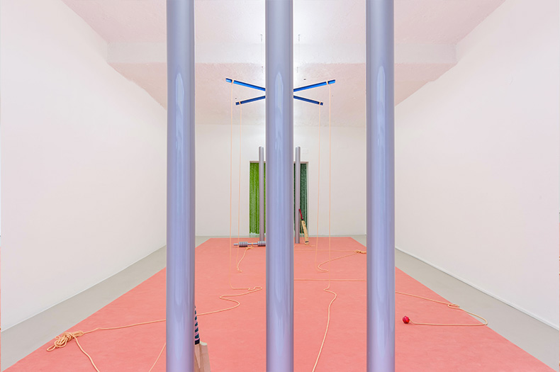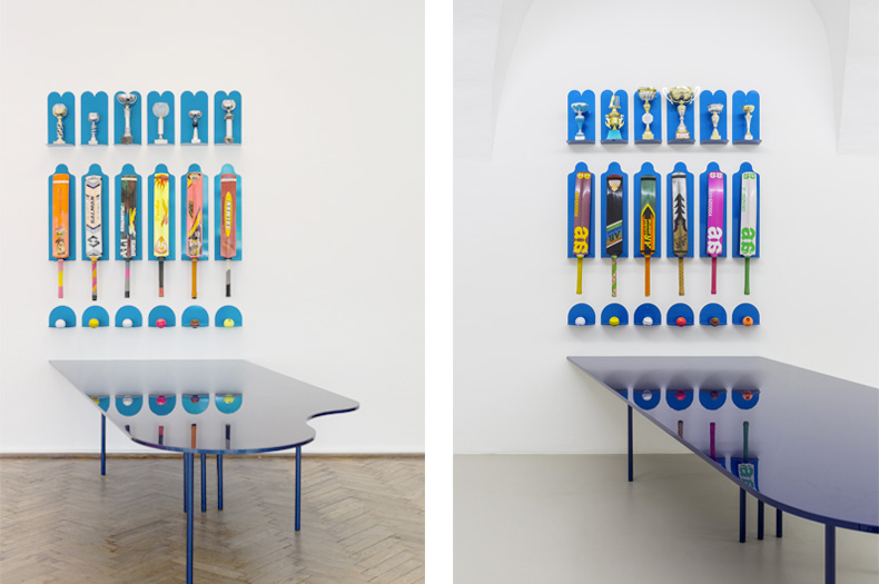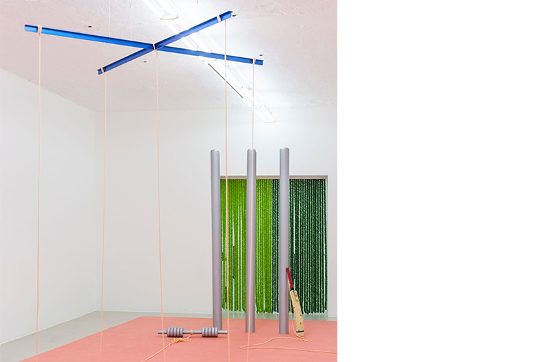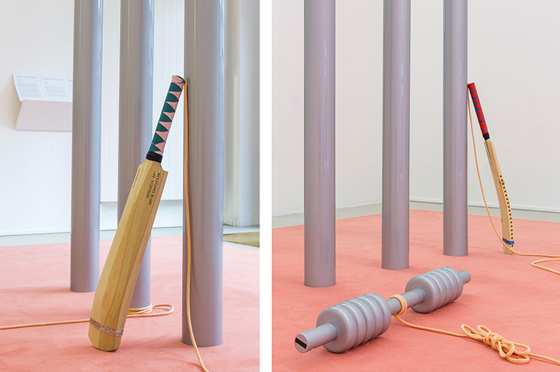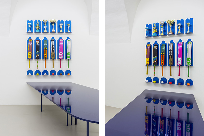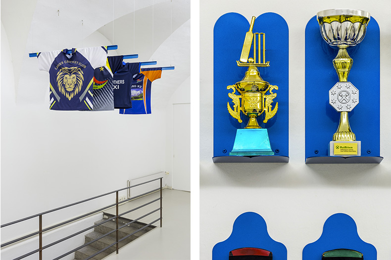 “It’s just not cricket” is more than a simple exposition of objects and equipment related to the sport of cricket, even if at first glance if may look like this. The idiomatic meaning of this expression, as quintessentially English as the game of cricket itself, gives rise to the idea that we are dealing with an injustice: In English linguistic jargon, this phrase is used to express indignation at a lack of fairness or an injustice that has occurred. A colourful carpet, oversized gates, a ball and two bats, each made in North and South Tyrol from local materials: These are the components which make up the set of a seemingly interrupted game, now installed in the showroom and only awaiting the return of the players. A “display altar” features Alì Saqib’s private collection of bats from around the world, as well as balls and trophies won in countless tournaments. Alongside all this, a collection of shirts belonging to the numerous active teams in South Tyrol: Laives, Brenner, Sterzing, Auer, Bolzano – communities that have their own cricket teams and tournaments, but with little public awareness of their existence. The encounter with young cricketers from Pakistan, Afghanistan, India and Sri Lanka, who in some cases have lived for decades on both sides of the Brenner Pass, offers respite from the usual rhetoric of identity, borders, and of north and south. The circular history of cricket, which has returned to Europe from the British colonies, spreading under very different circumstances, provides the opportunity to reflect on the values of today’s urban and rural environments, as well as challenging the categories of time, entertainment, spectacle and spectatorship.